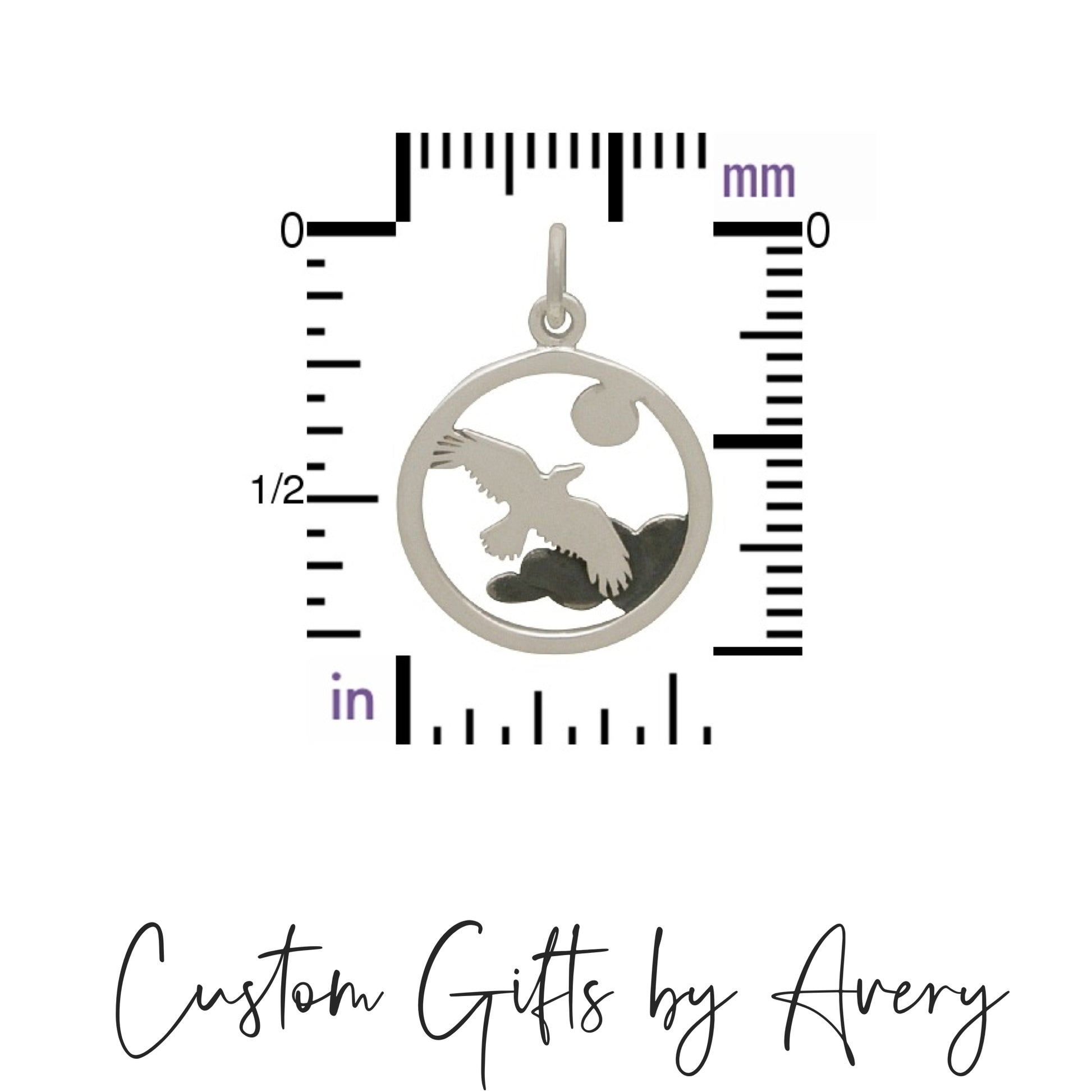 Crafted from .925 sterling silver this layered pendant features a raven in flight. The brightly polished raven and full moon contrasts beautifully from the darker oxidized night clouds in the background.