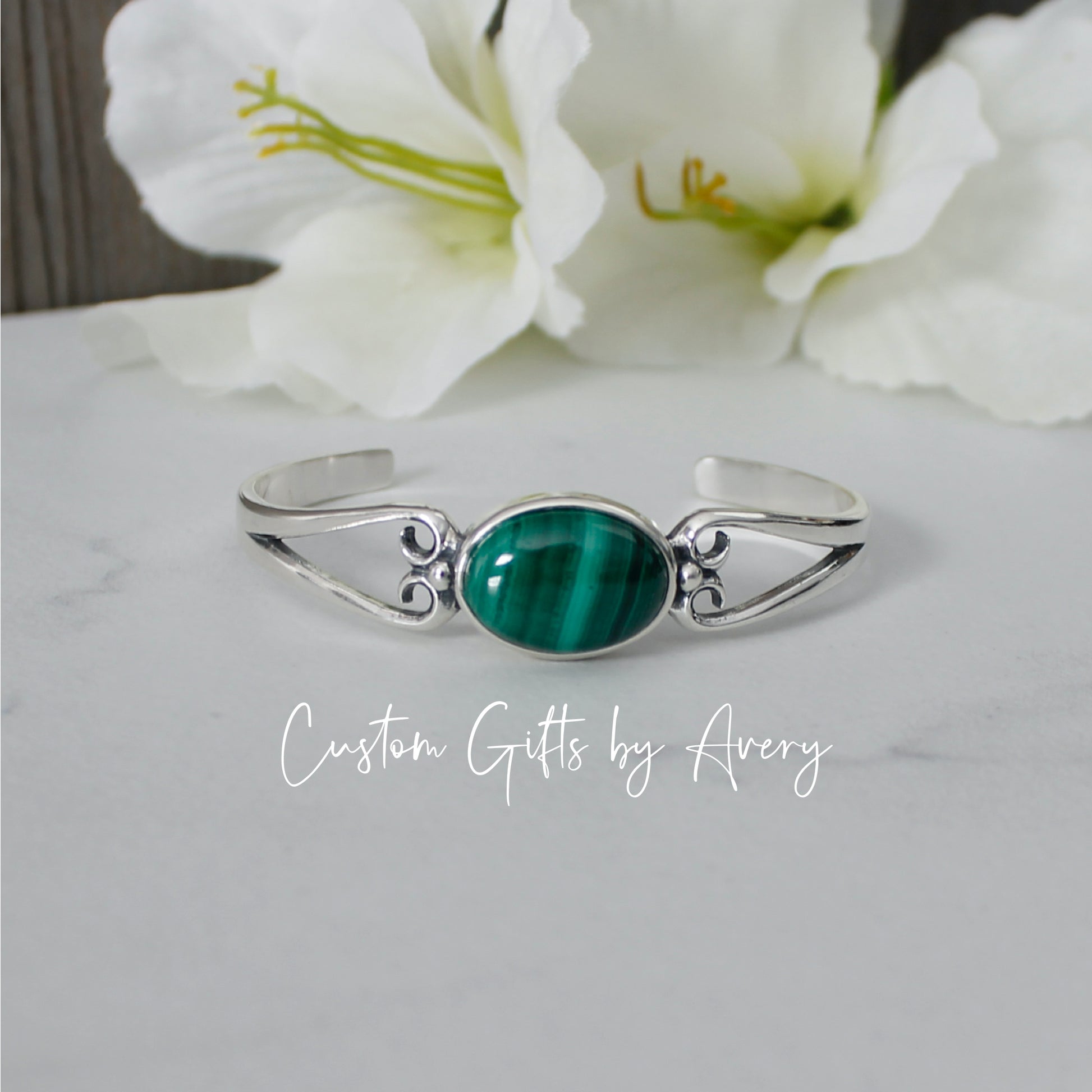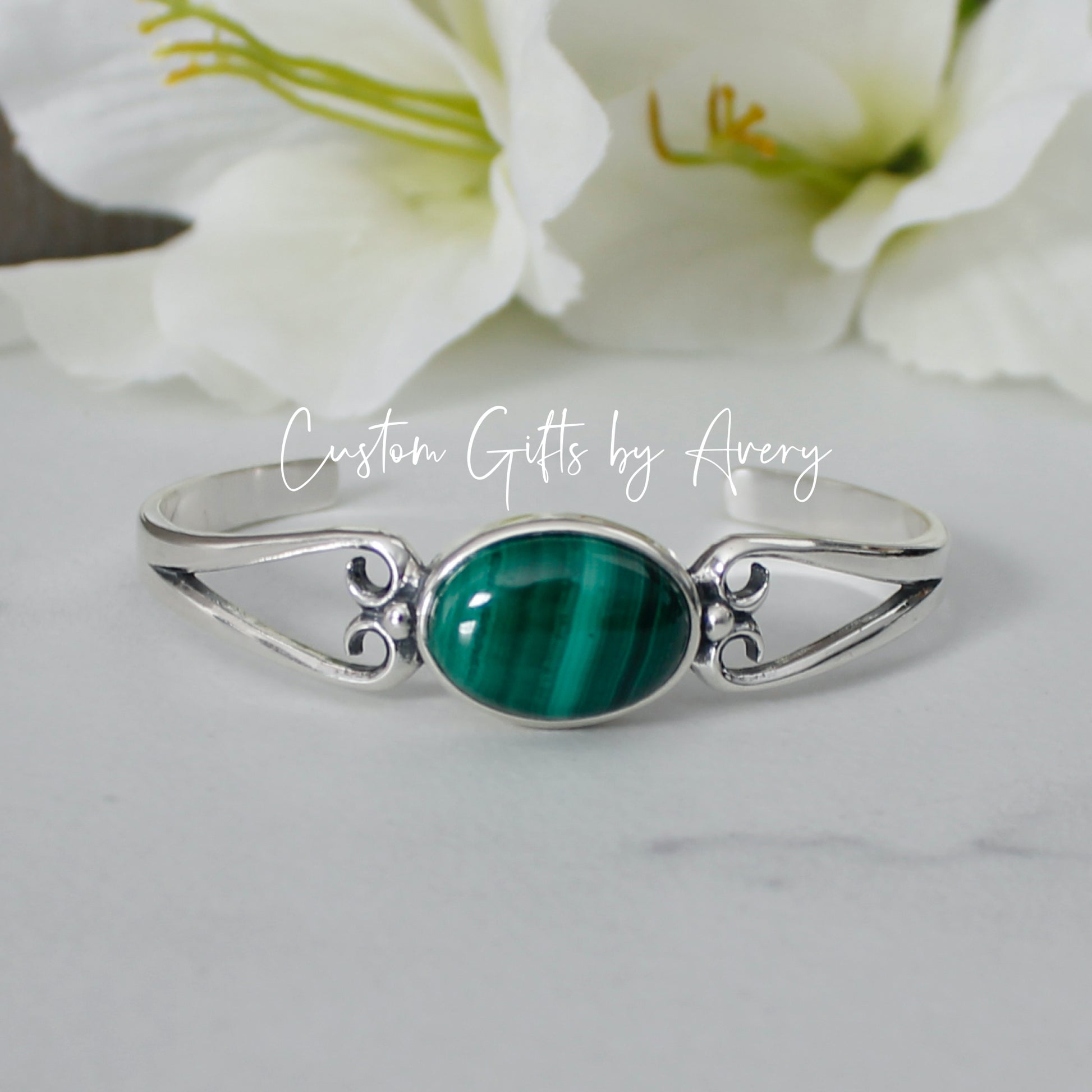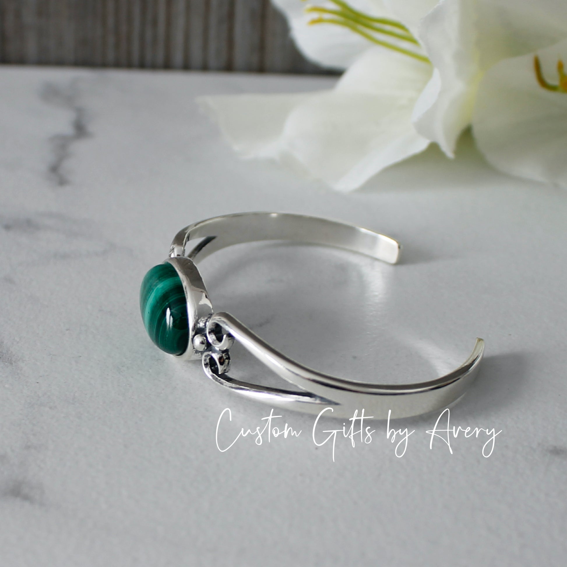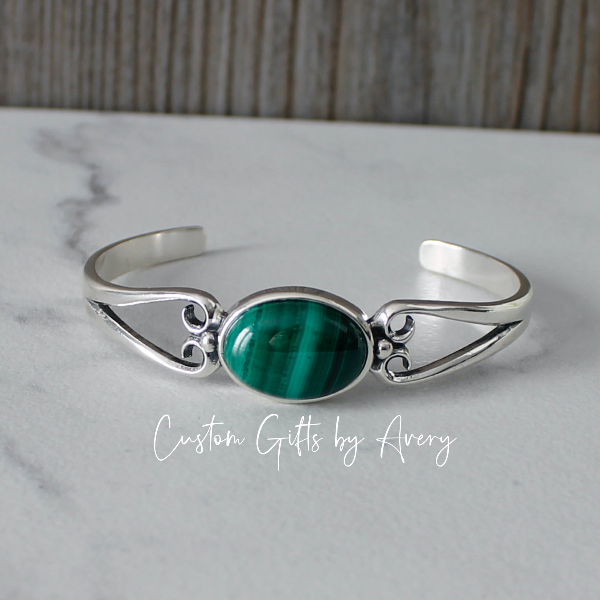 This gemstone cuff bracelet is crafted in solid .925 sterling silver and features a natural green malachite gemstone. The cuff features a simple open-work heart scroll design. The back of the cuff is solid, complete enclosing the back of the gemstone.