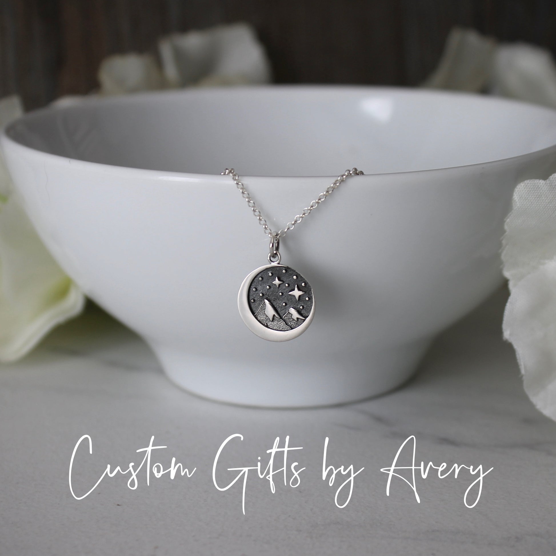 Crafted in solid .925 sterling silver pendant depicts snow capped mountains against a darkly oxidized night sky. The twinkling stars above the mountain tops and crescent moon that surrounds the piece, offer added depth and dimension to this pendant.