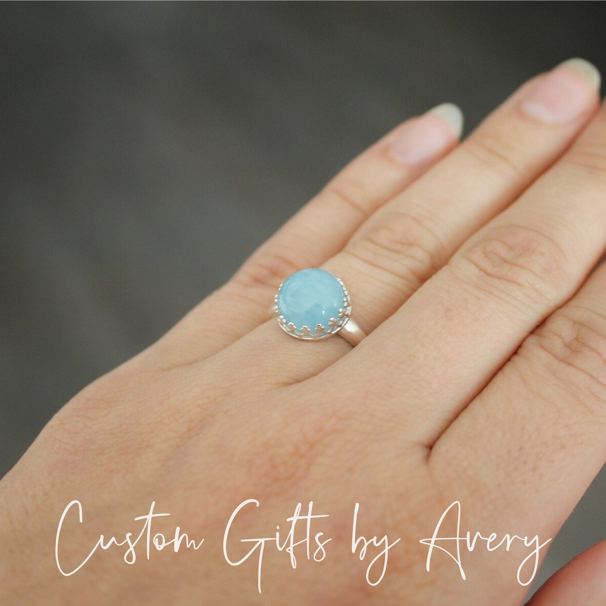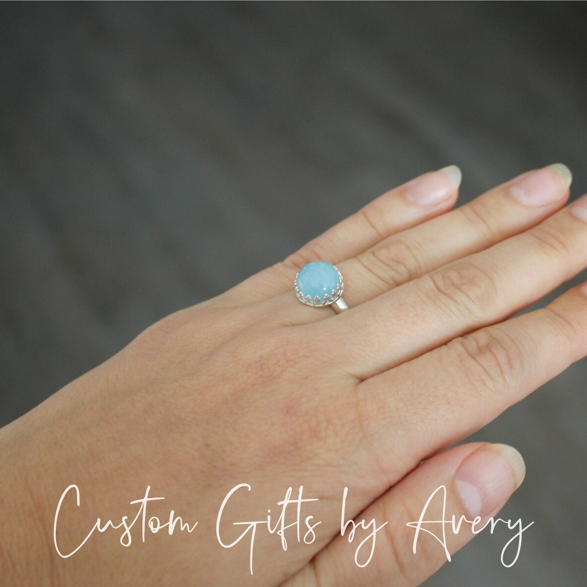 Beautiful blue aquamarine & sterling silver! An absolutely gorgeous natural aquamarine gemstone sits in a bezel crown setting. This ring has a nice solid band, and a larger blue aquamarine gemstone.