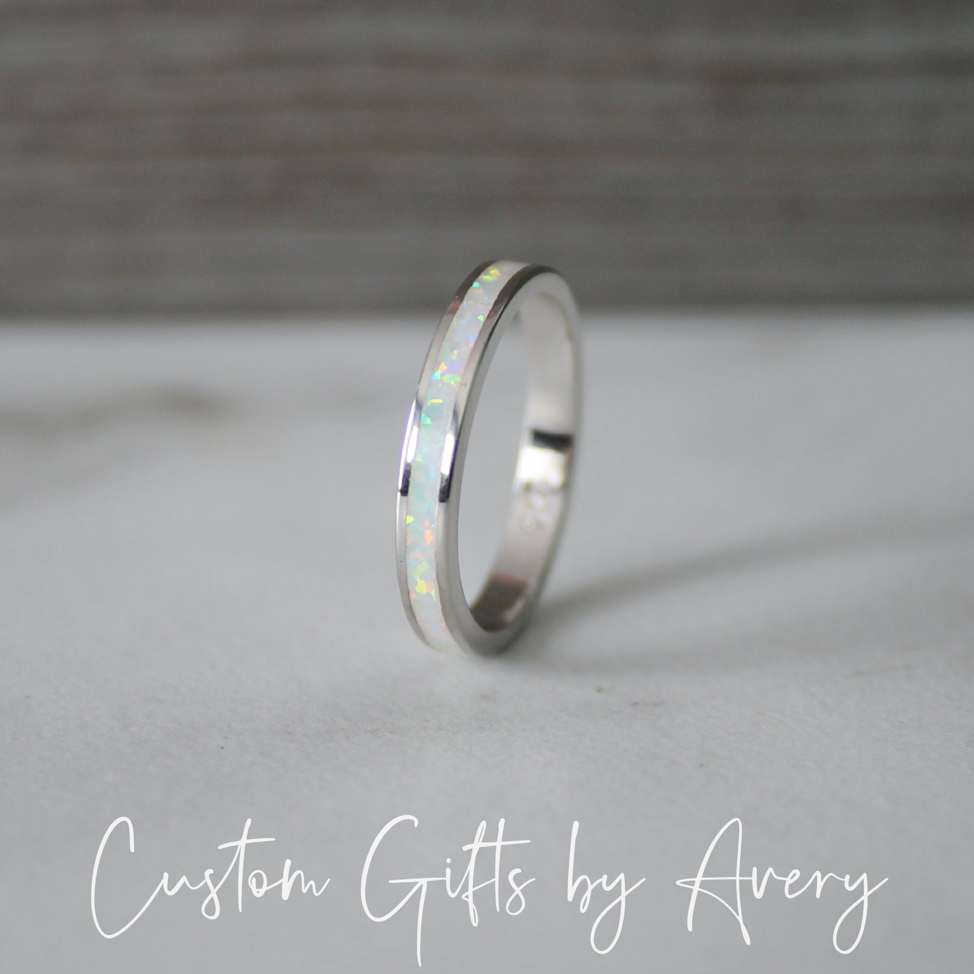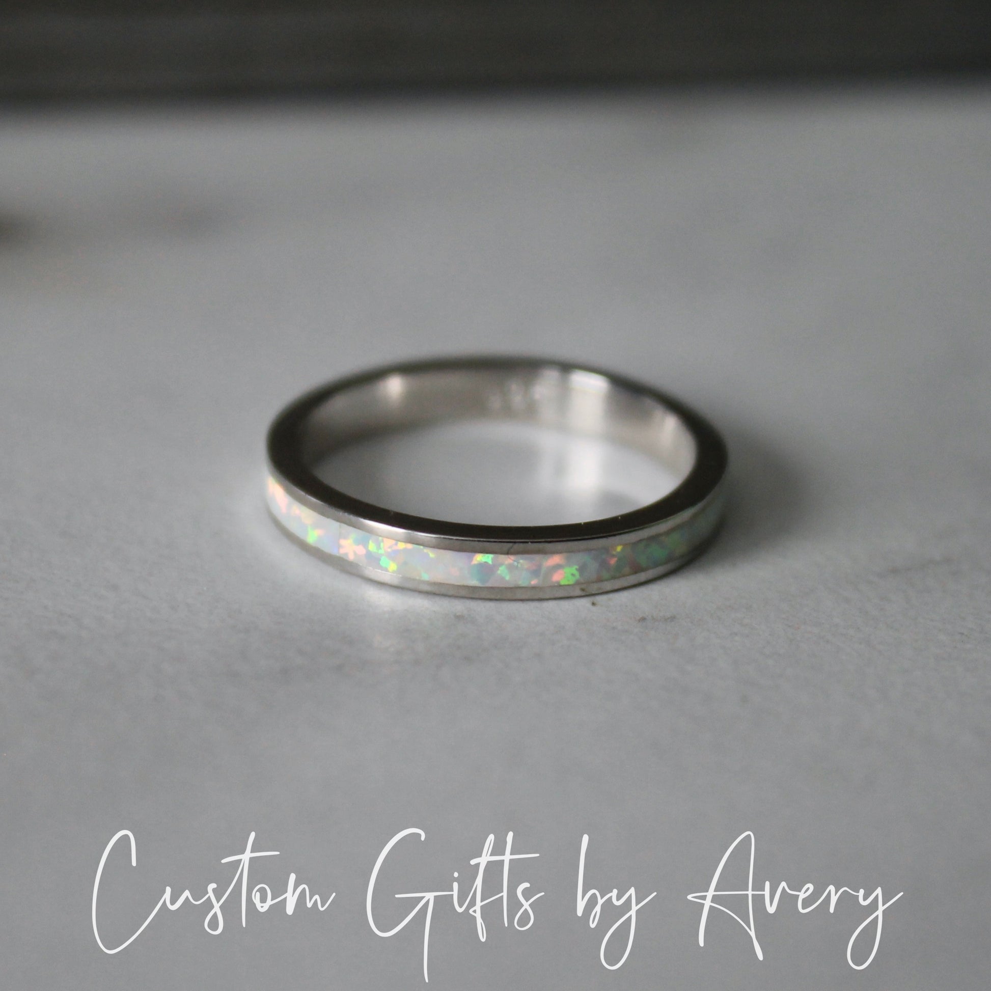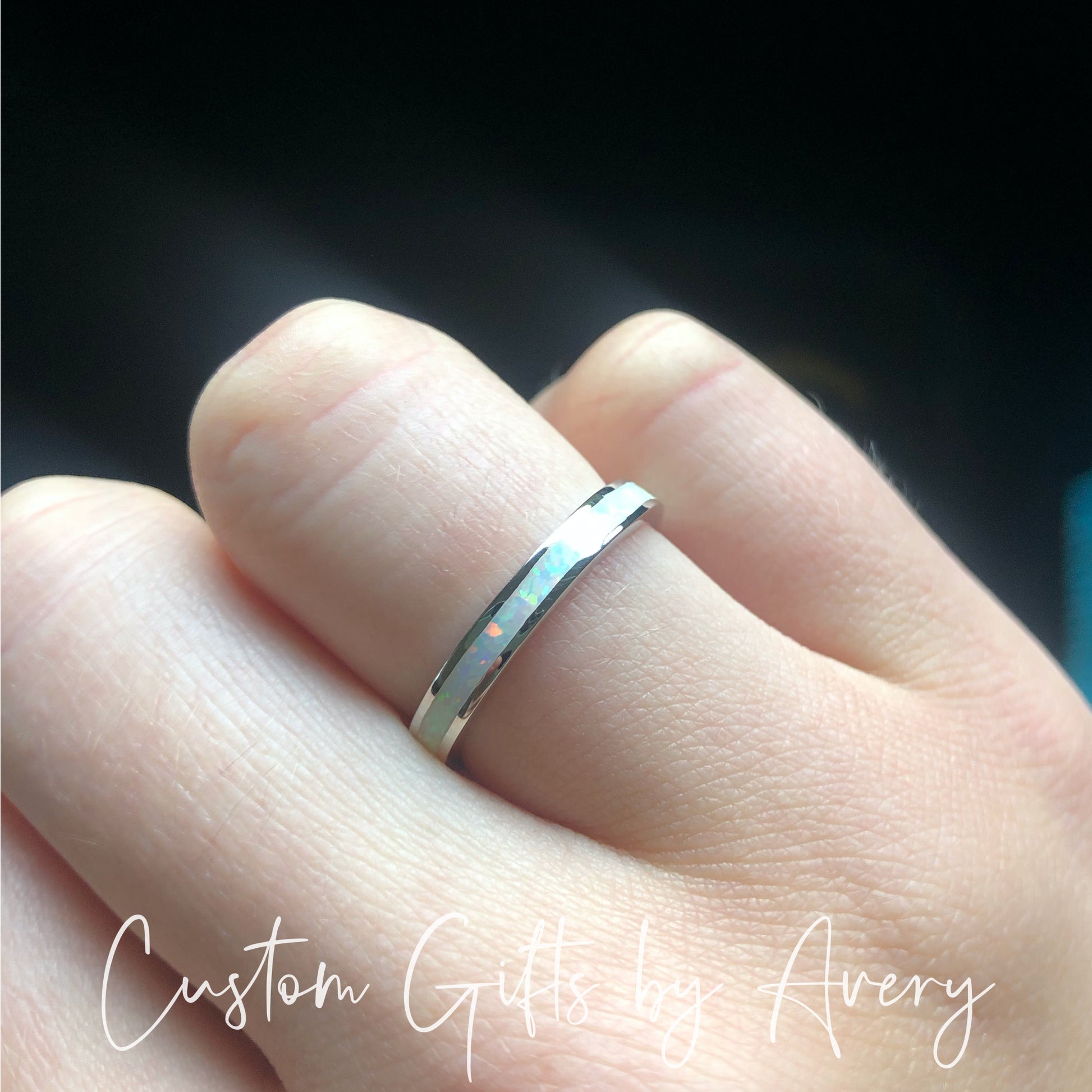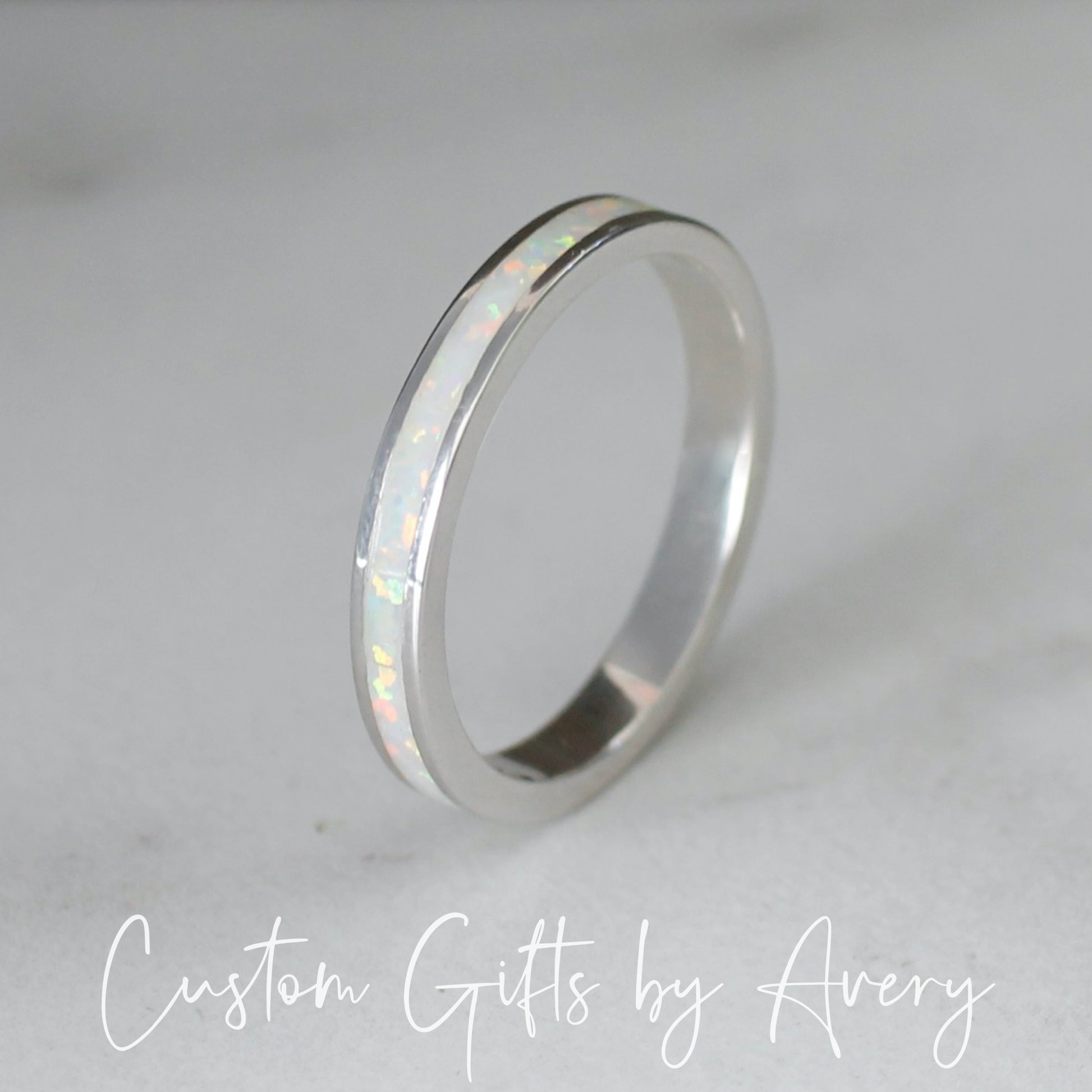 An absolutely gorgeous white lab opal gemstone stacking ring crafted in solid .925 sterling silver. The pinfire in this opal is beautiful in the light and flashes a multitude of colours. The opal in this ring goes all the way around the band. Wear it alone or pair it with other stacking rings. This ring makes a beautiful gift for those born in October, or anyone who loves the beauty of a classic opal.