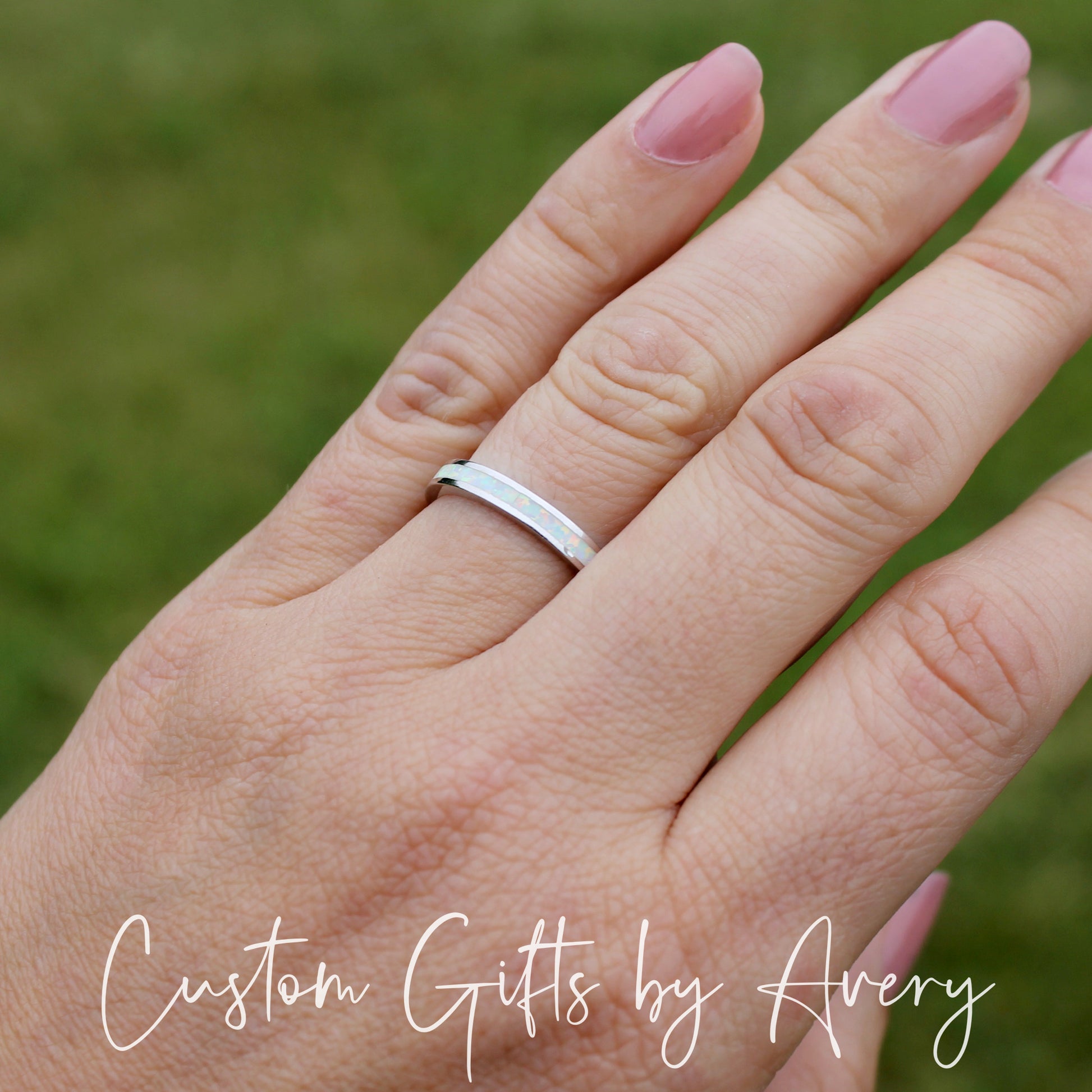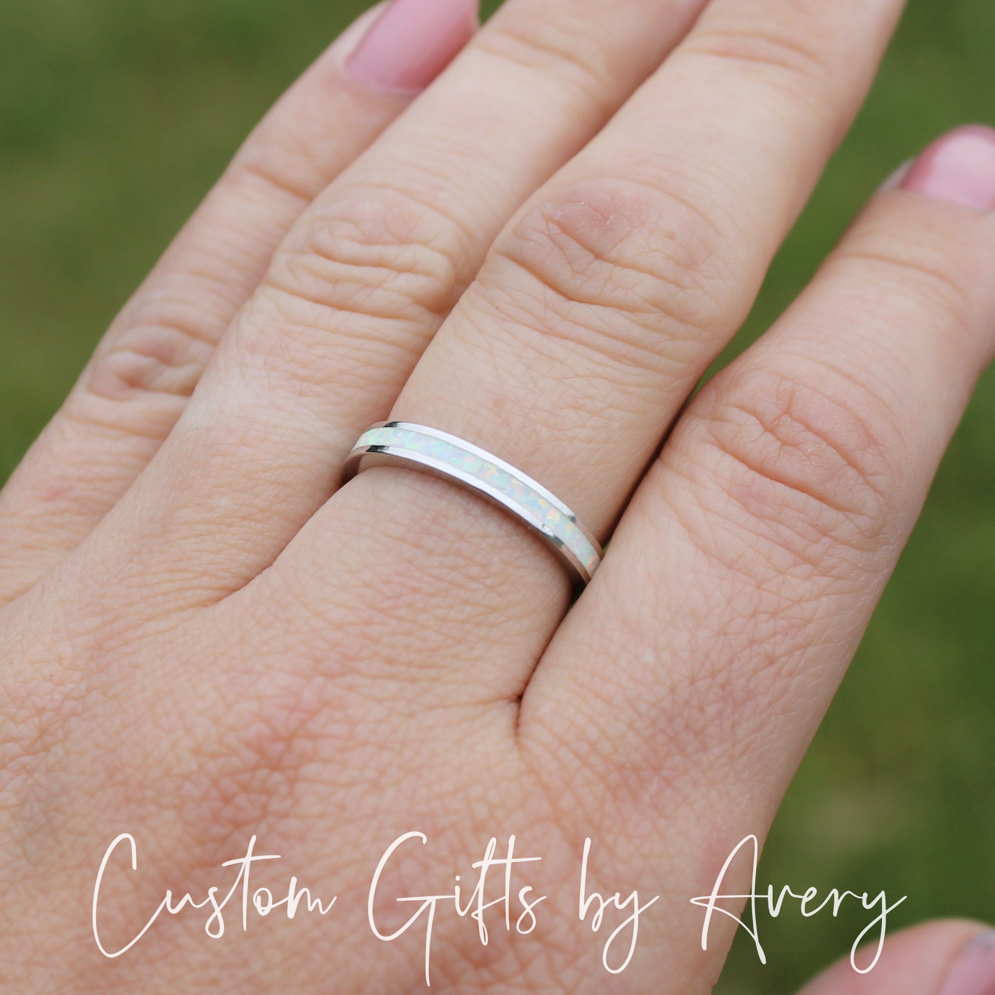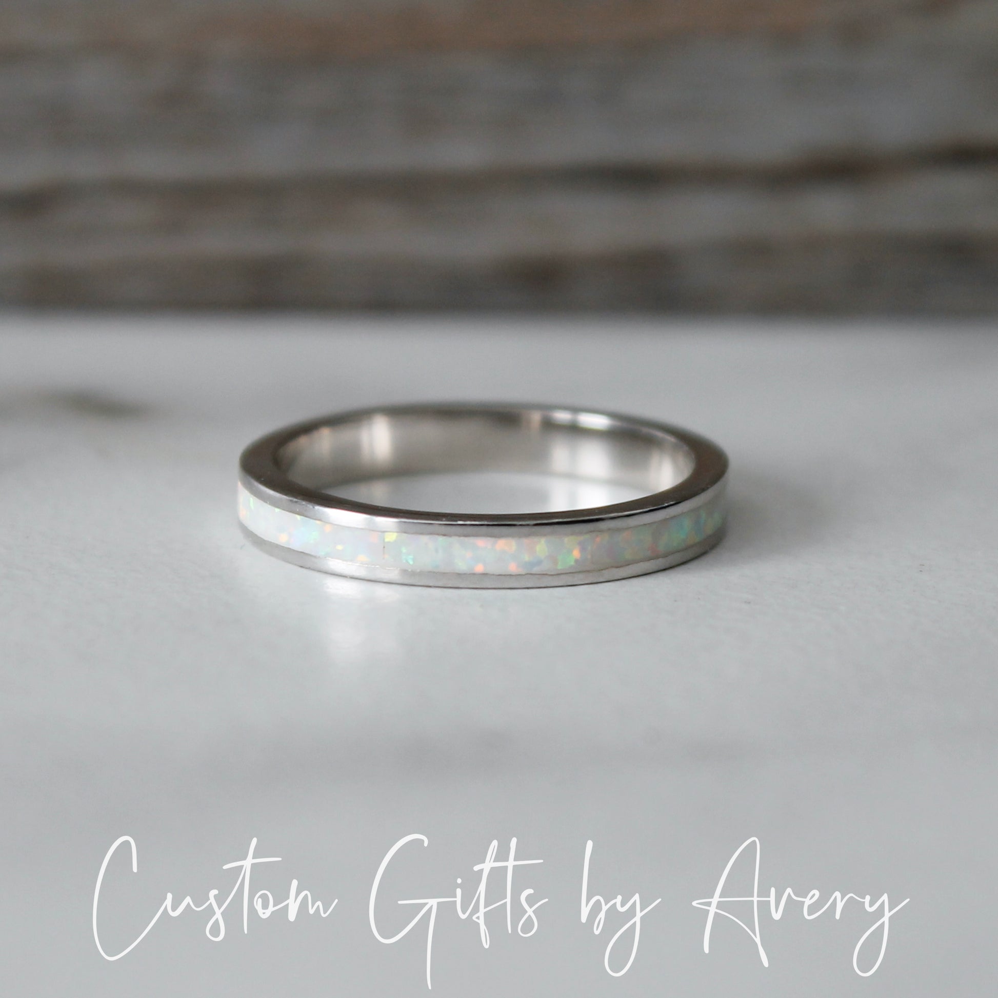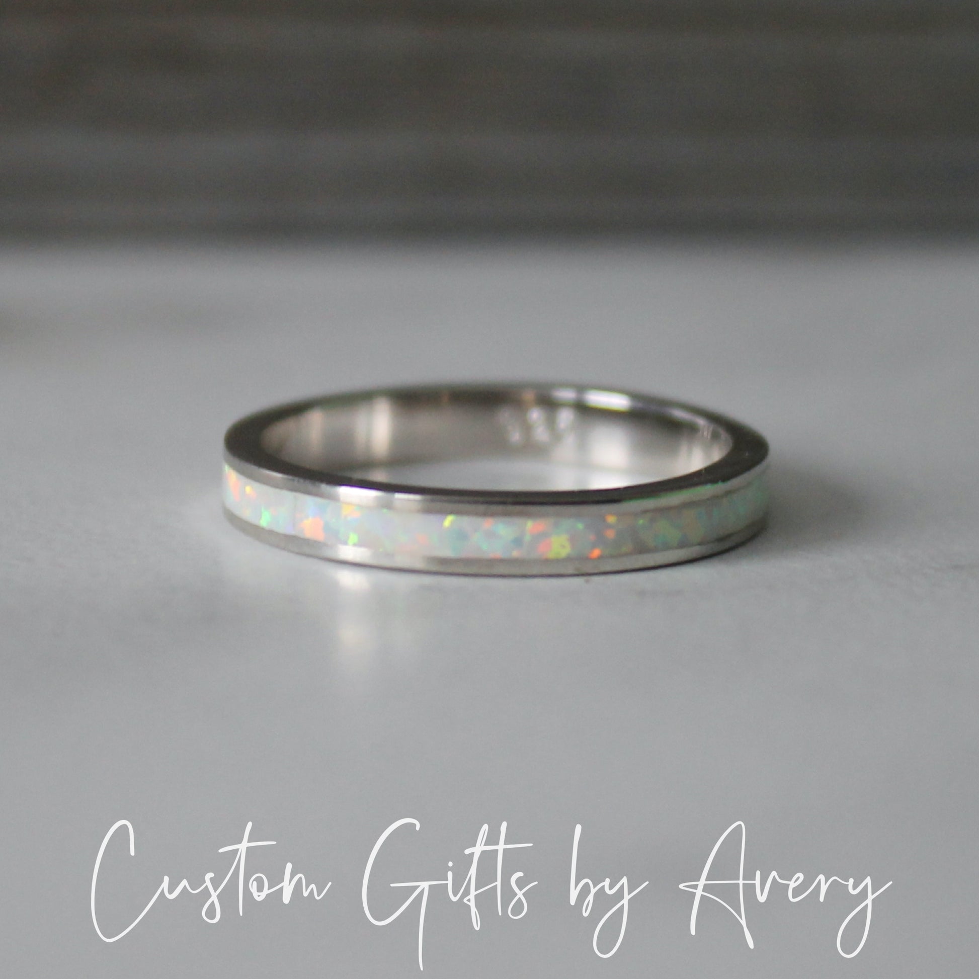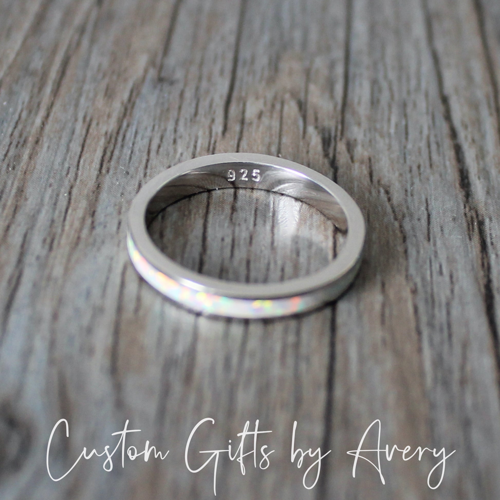An absolutely gorgeous white lab opal gemstone stacking ring crafted in solid .925 sterling silver. The pinfire in this opal is beautiful in the light and flashes a multitude of colours. The opal in this ring goes all the way around the band. Wear it alone or pair it with other stacking rings. This ring makes a beautiful gift for those born in October, or anyone who loves the beauty of a classic opal.