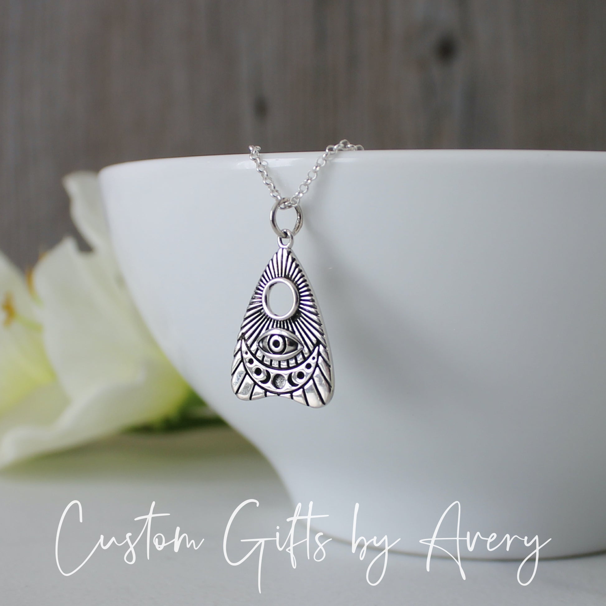 Crafted in .925 sterling silver, this Ouija planchette is incredibly detailed. With it's all seeing eye, moon phases, hole cut out for letter selections it look just like the real thing! The Ouija board became popular in the 1800's at a time when seances were common ~ prompted by the rise of spiritualism the Ouija board was born. Also known as a spirit board, these tools allowed the user to communicate to with the dead. Fun, harmless game or tool of the devil? You decide.