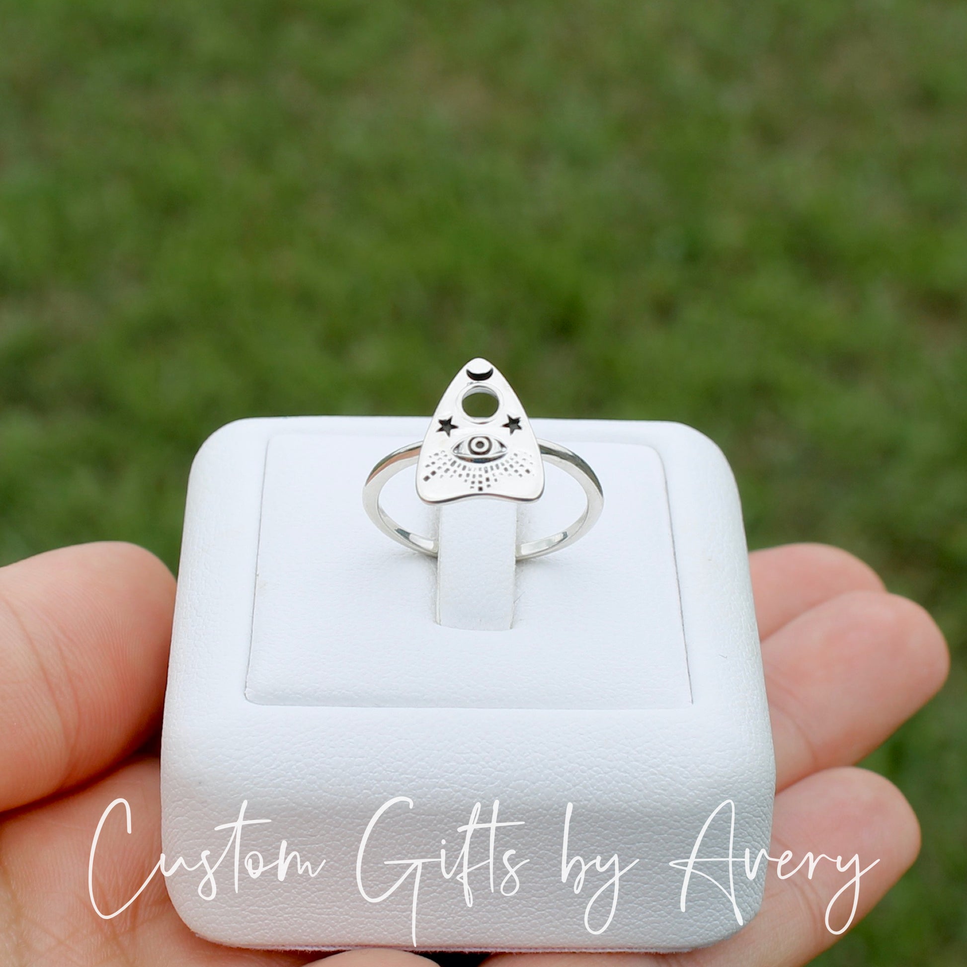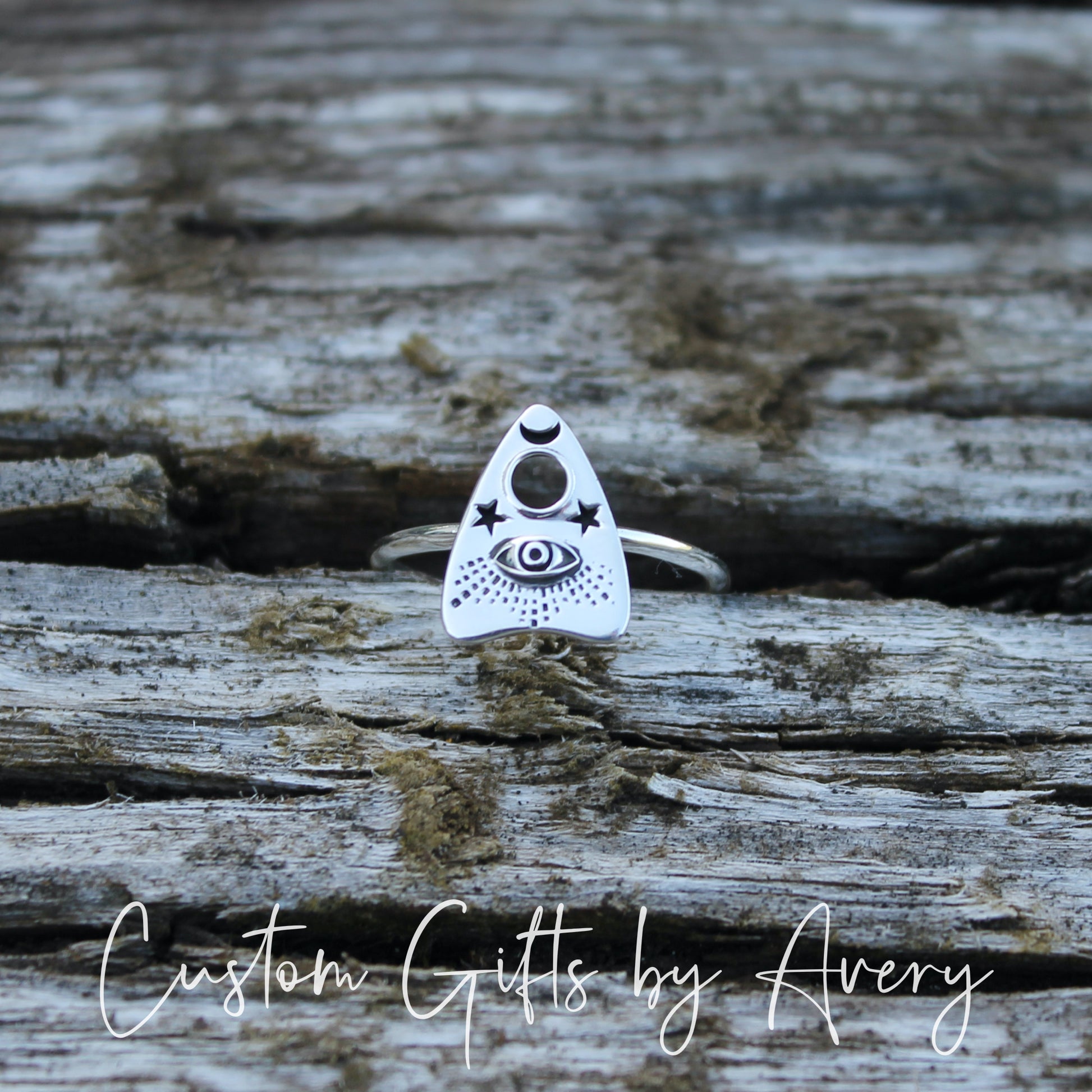 Crafted in .925 sterling silver, this Ouija planchette ring is incredibly detailed. With it's all seeing eye, moon phases, hole cut out for letter selections it look just like the real thing! The Ouija board became popular in the 1800's at a time when seances were common ~ prompted by the rise of spiritualism the Ouija board was born. Also known as a spirit board, these tools allowed the user to communicate to with the dead. Fun, harmless game or tool of the devil? You decide.