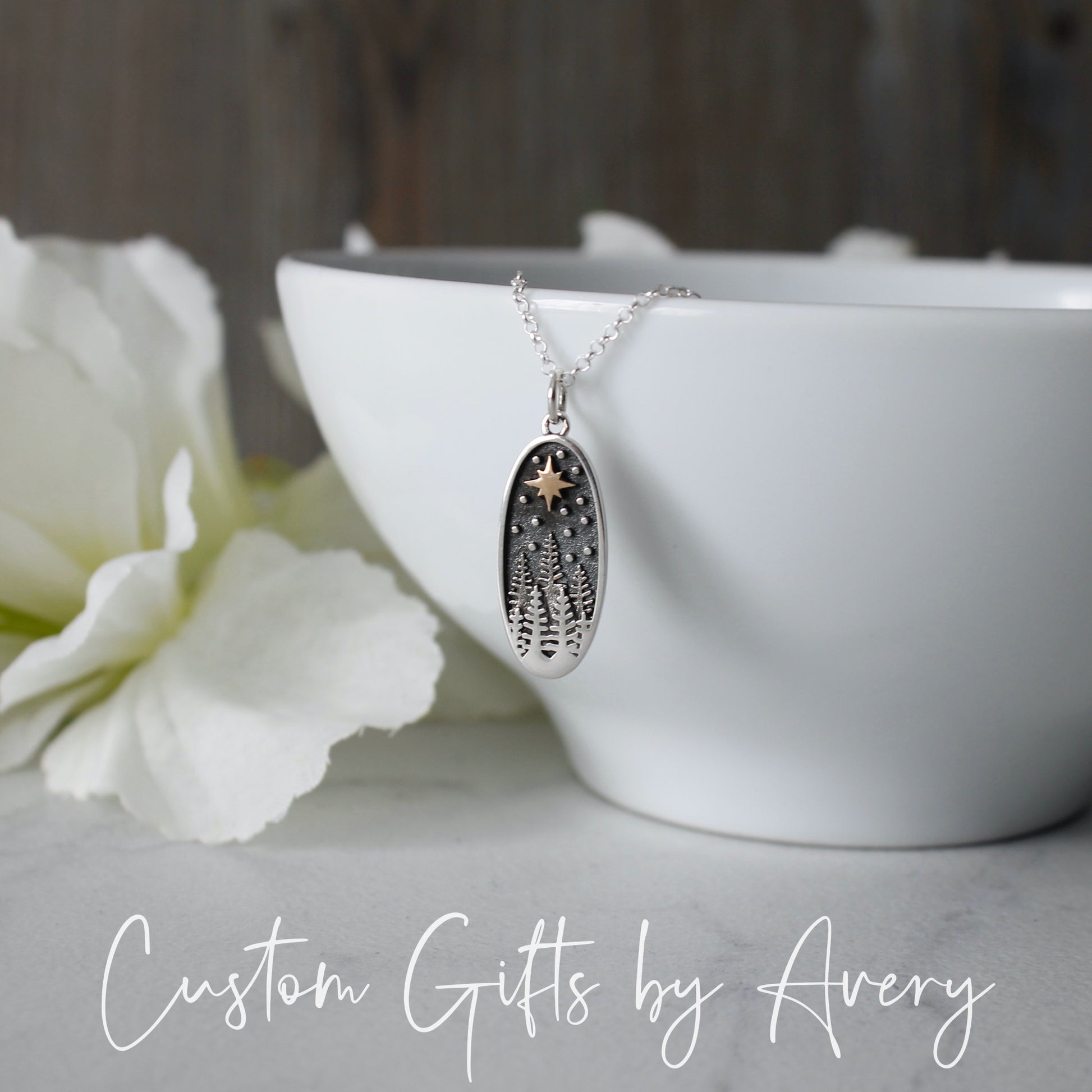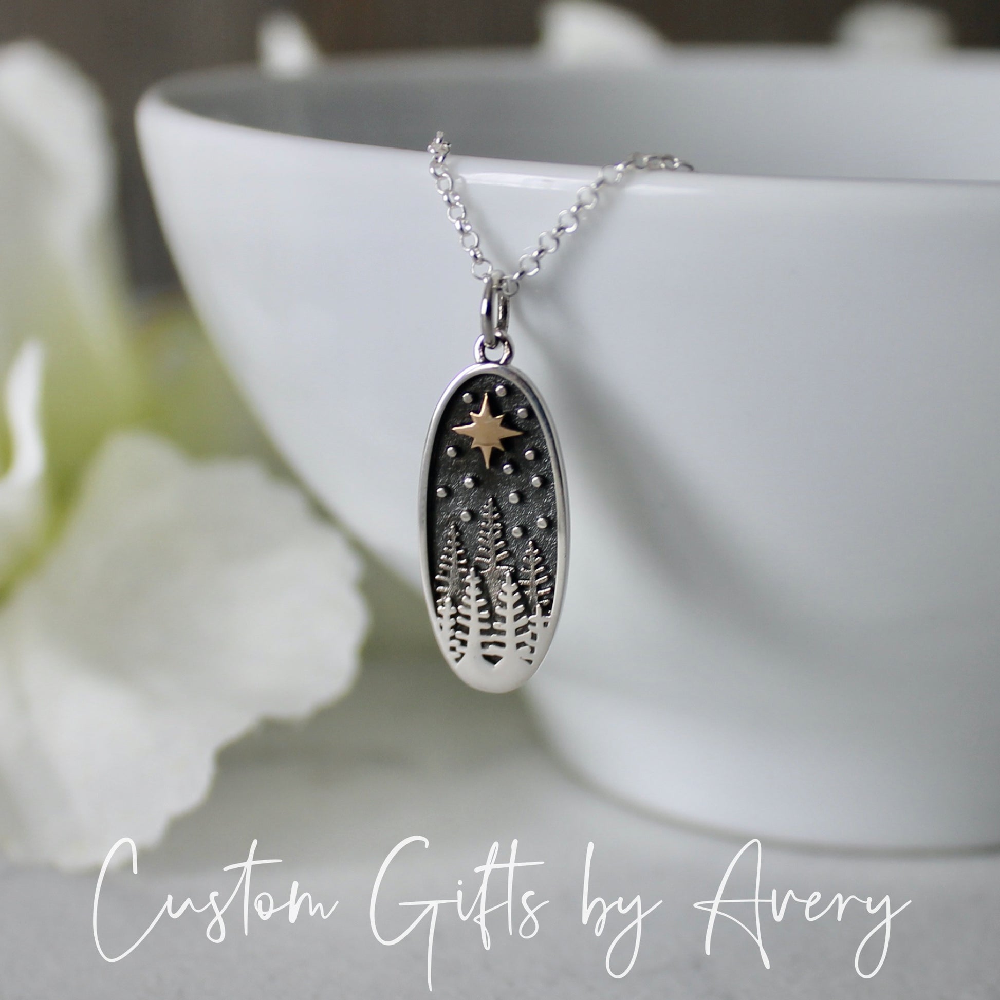 Crafted in solid sterling silver this multi-layer oval pendant depicts the the beauty of a pine tree forest in the night time sky. The brightly polished silver of the pine trees in the foreground contrasts against the darker trees and darkly oxidized night time sky in the background. Tiny raised stars and a bronze north star against the dark sky give an added texture to the piece.