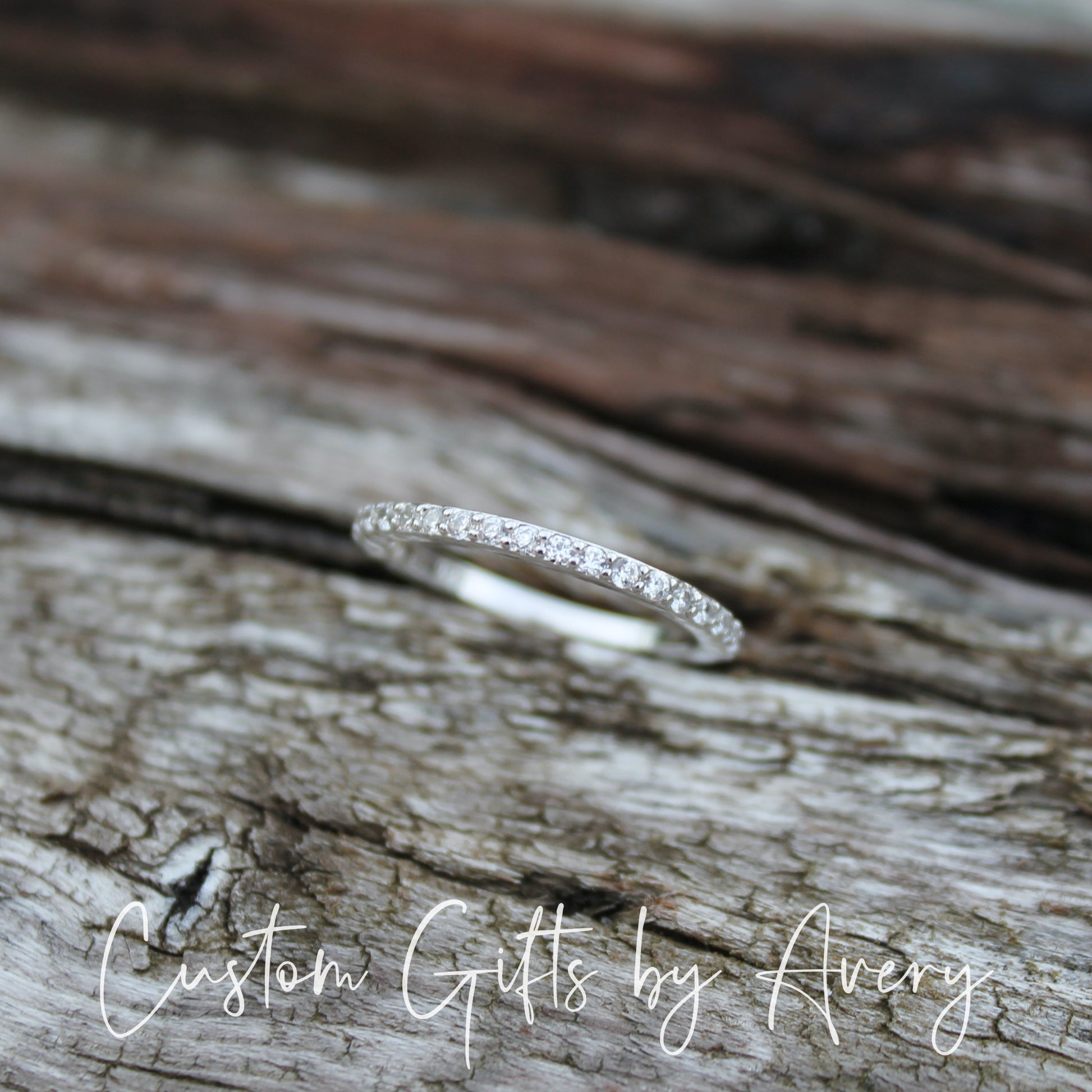 Crafted in solid sterling silver, this gorgeous eternity ring sparkles with tiny cubic zirconias. This tiny gem is perfect for a minimalist look, or can be stacked with other rings for a more dramatic effect.