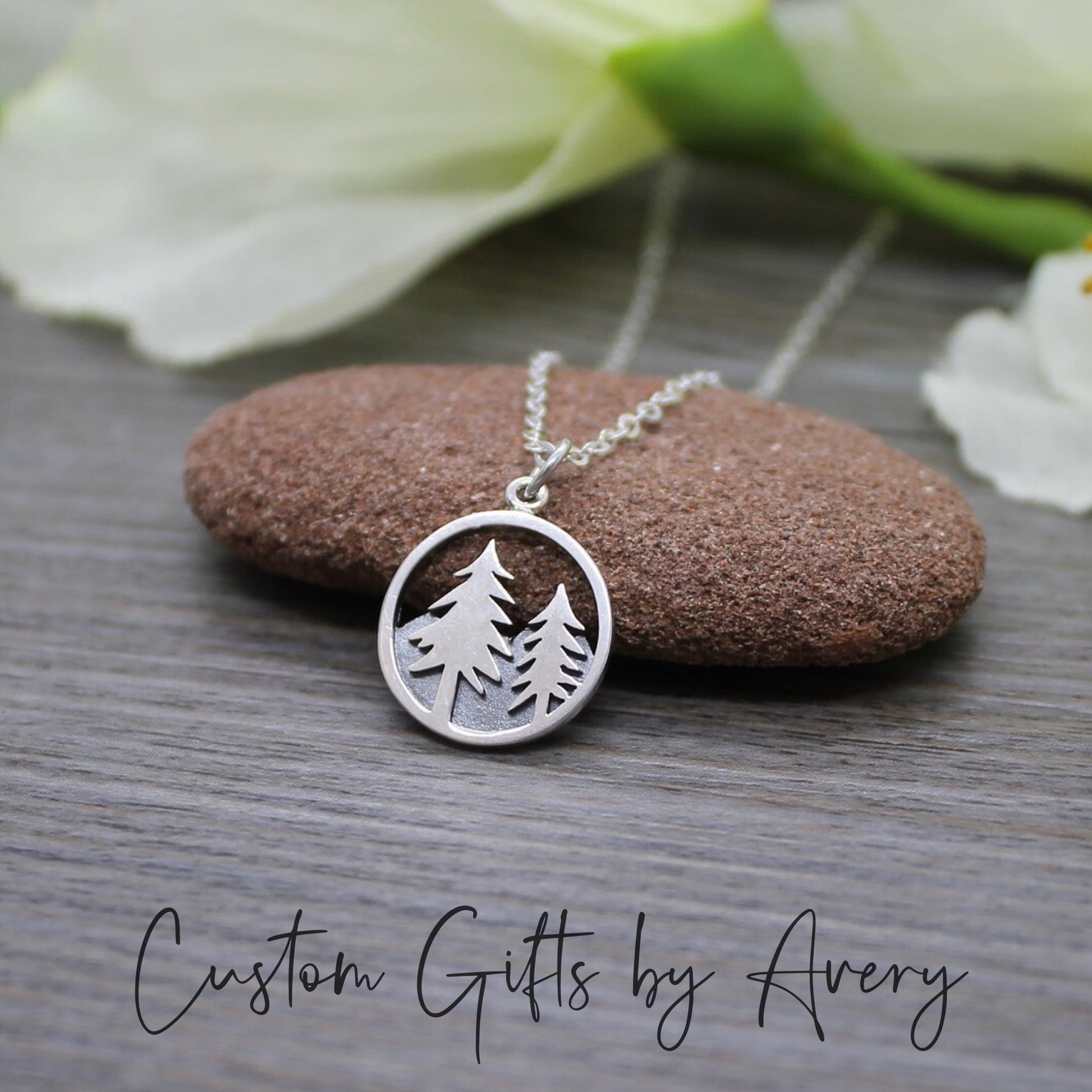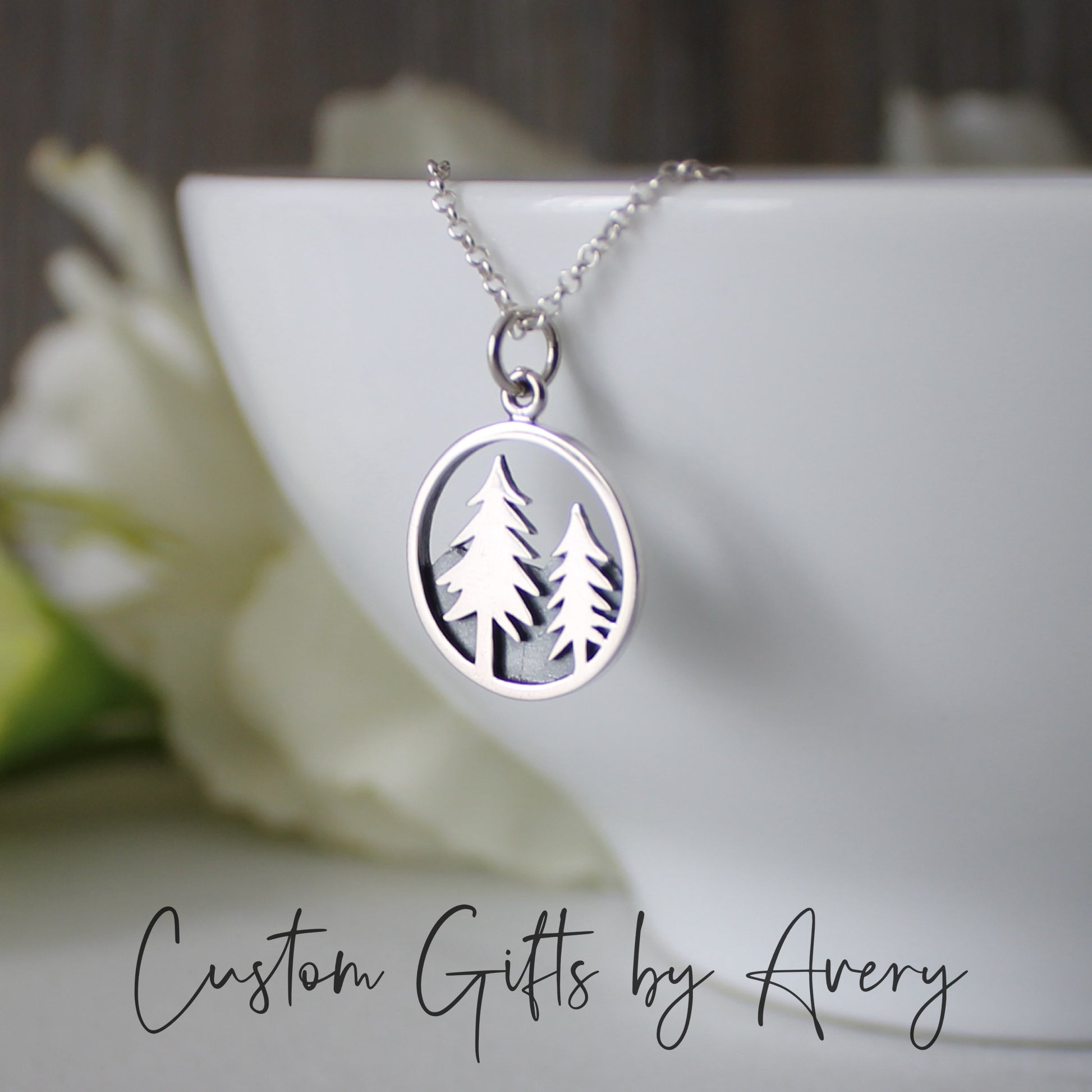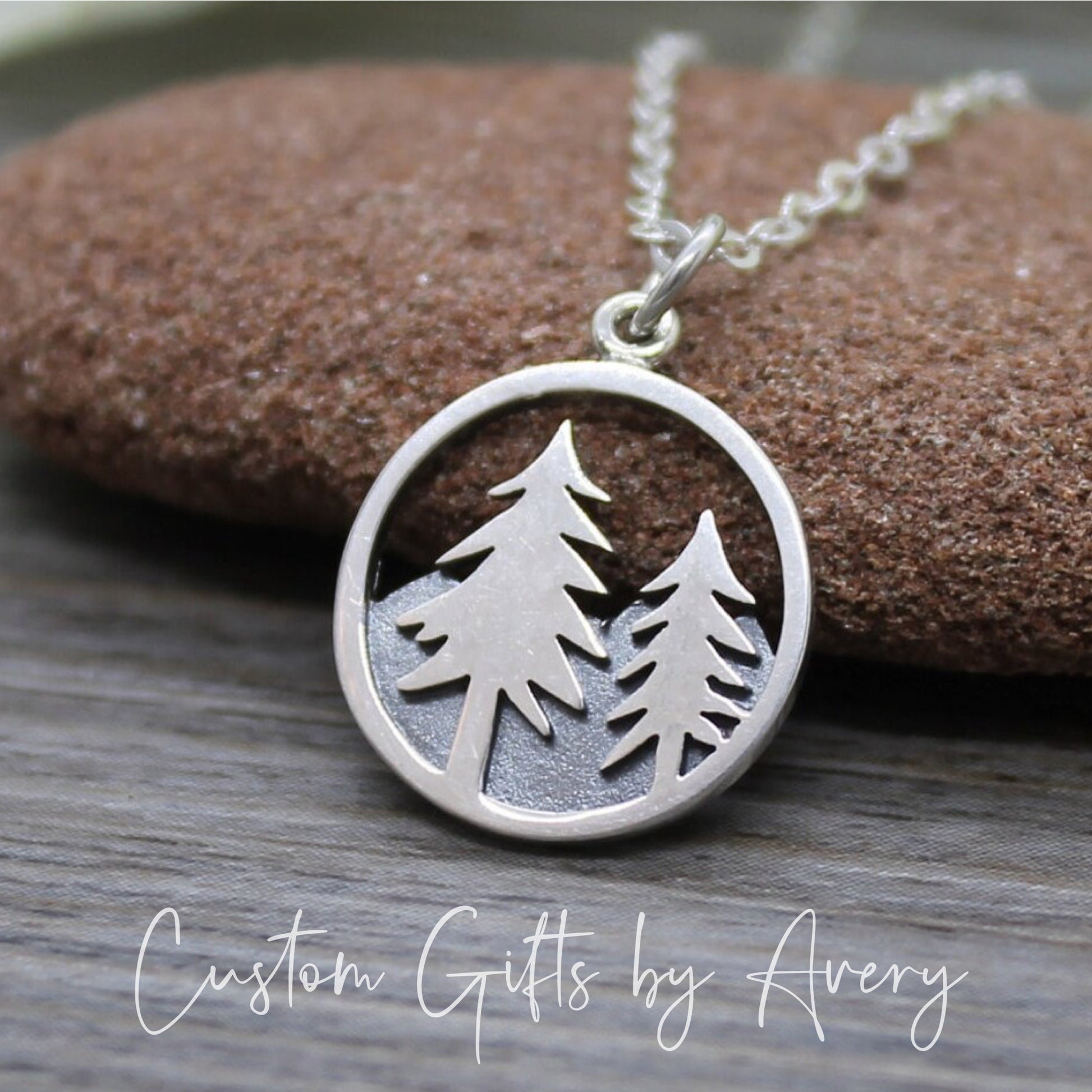 This modern forest and mountain necklace features two-toned .925 sterling silver. The first layer of pine trees is bright sterling silver and the behind them lies oxidized mountains.