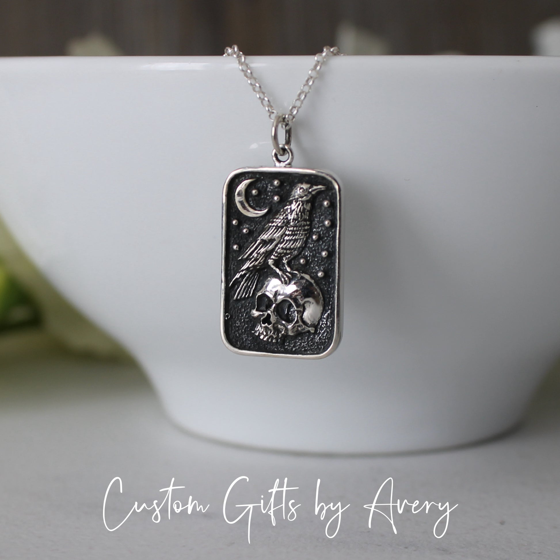 This sterling silver raven and skull pendant is crafted in solid .925 sterling silver. The polished raven and skull detailing is raised from the oxidized silver background giving it added depth. It is completed with raised crescent moon and dotted stars.