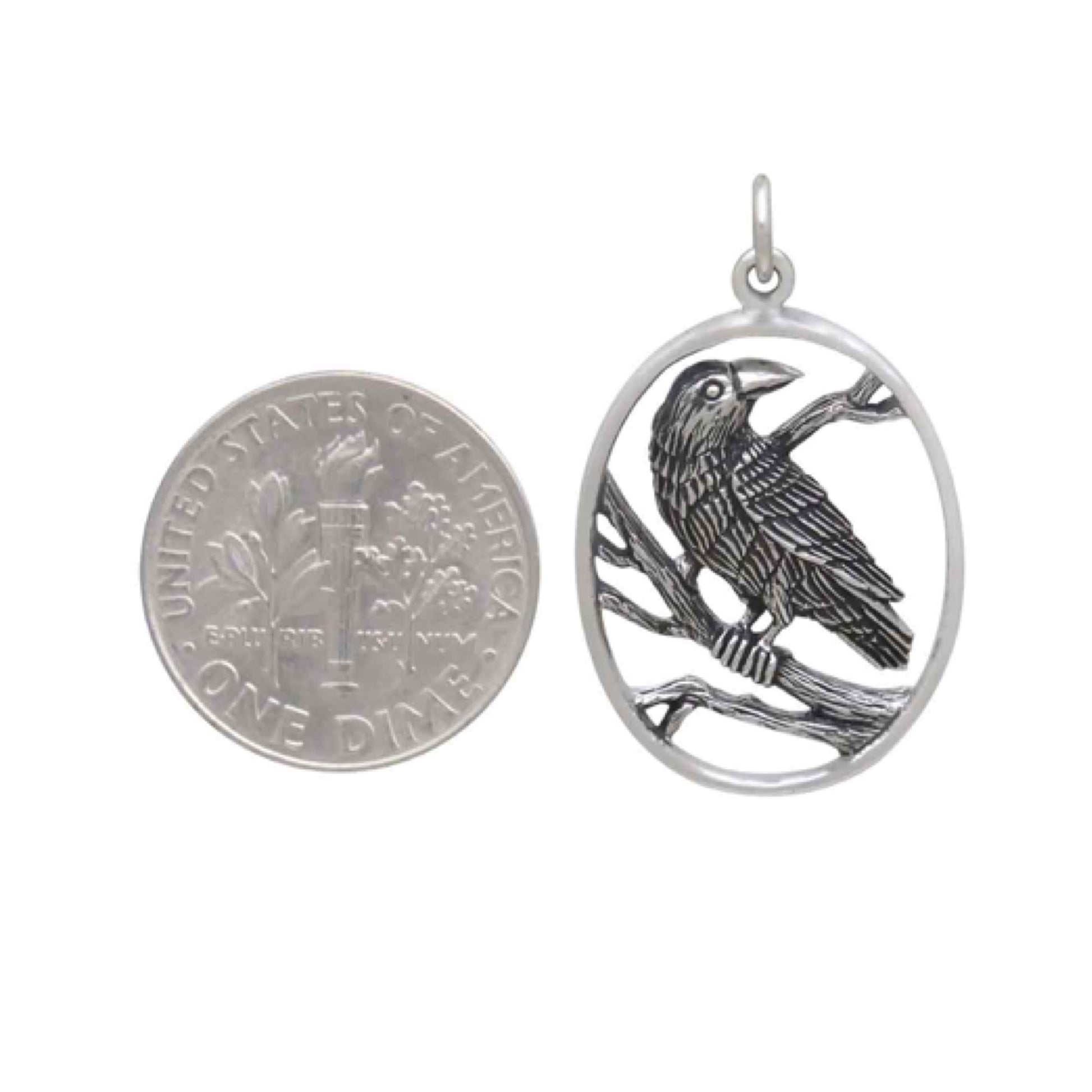 A highly detailed raven sits perched on gnarled tree branches. Crafted from .925 sterling silver this piece has been oxidized to highlight the details. The branches and raven are raised on the front with a smooth flat back giving this pendant a nice depth.