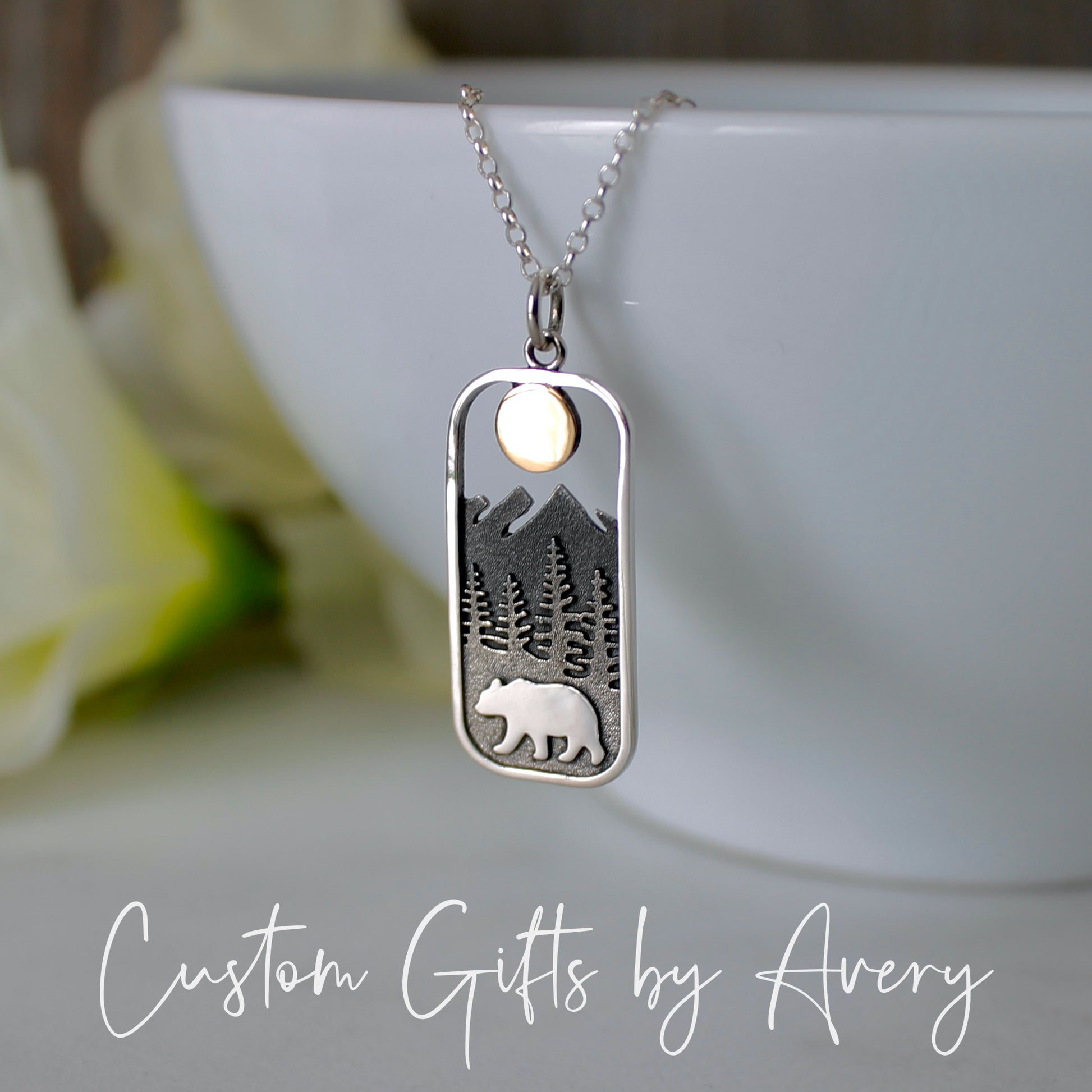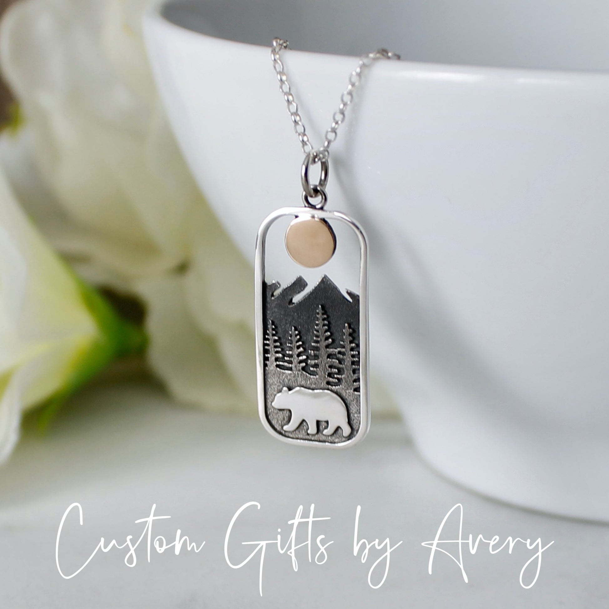 Sterling Silver Rectangular Bear and Forest Mountain Necklace