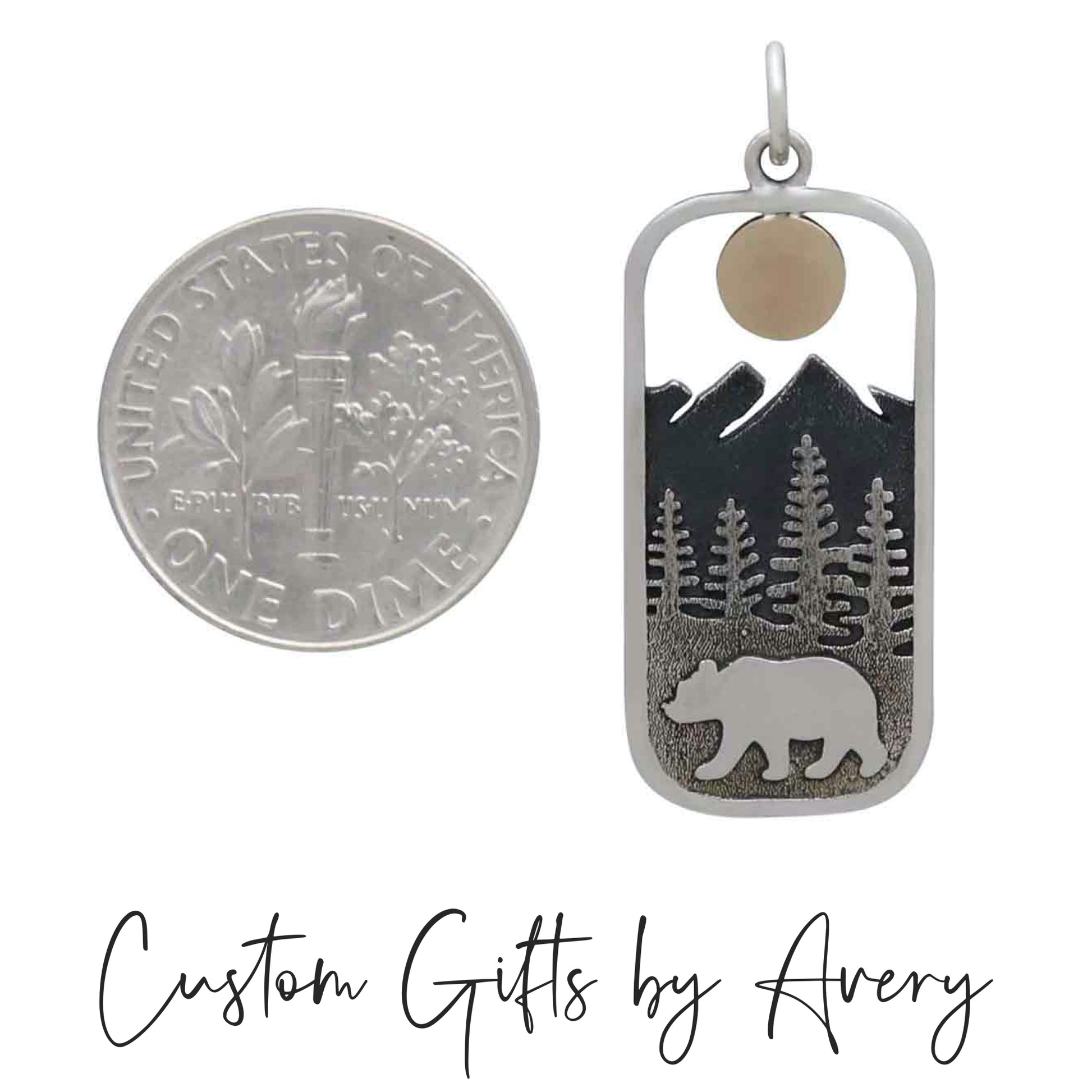 Crafted in sterling silver and bronze, this rectangular bear pendant features layers of brightly polished and oxidized silver to create a majestic forest mountain scene. Overlooking the forested mountain a bronze bronze sun gives a sophisticated mixed metal look.