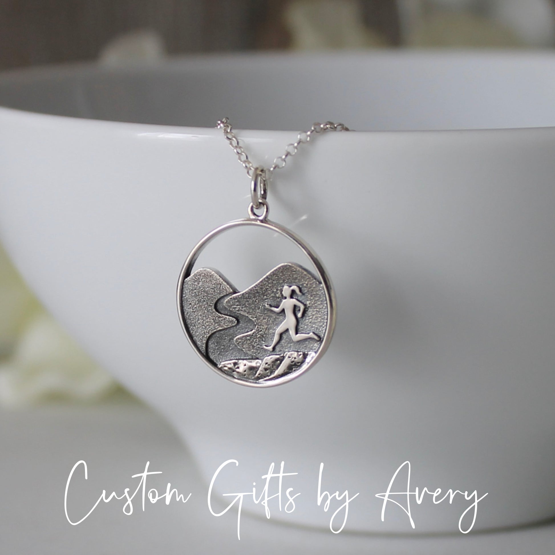 For the ladies who like to run! Created in solid .925 sterling silver, this pendant depicts the beauty of the female runner as she sprints off into the mountain path. The pendant is a mix of brightly polished and oxidized silver to highlight the detailing.