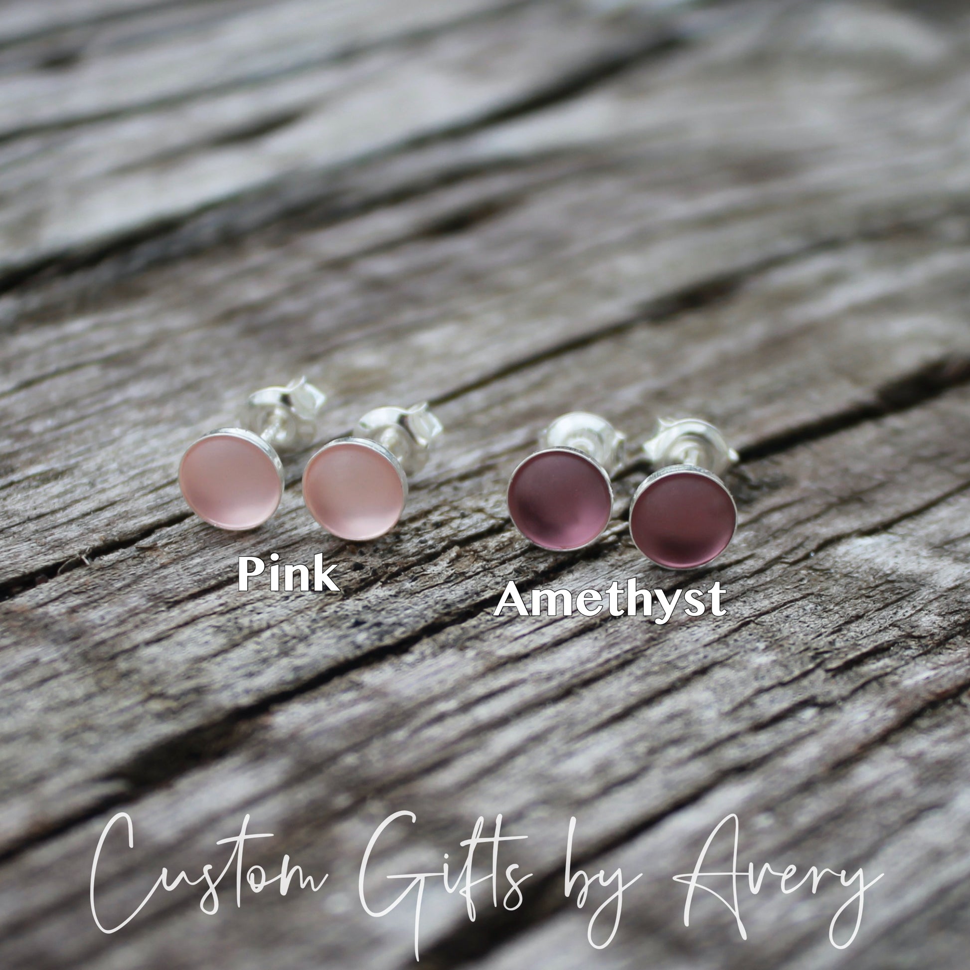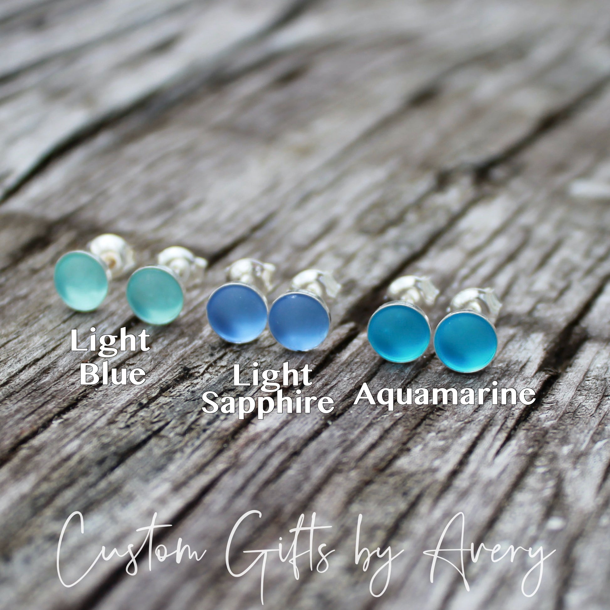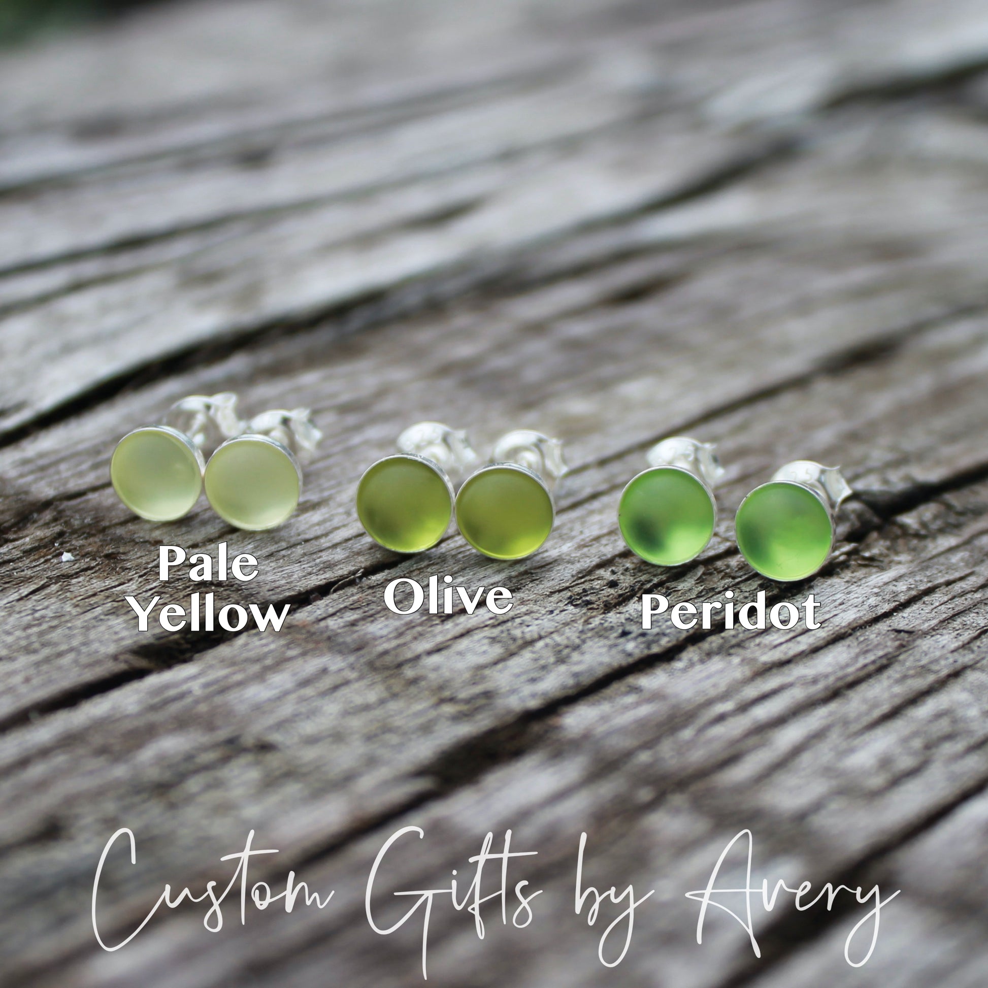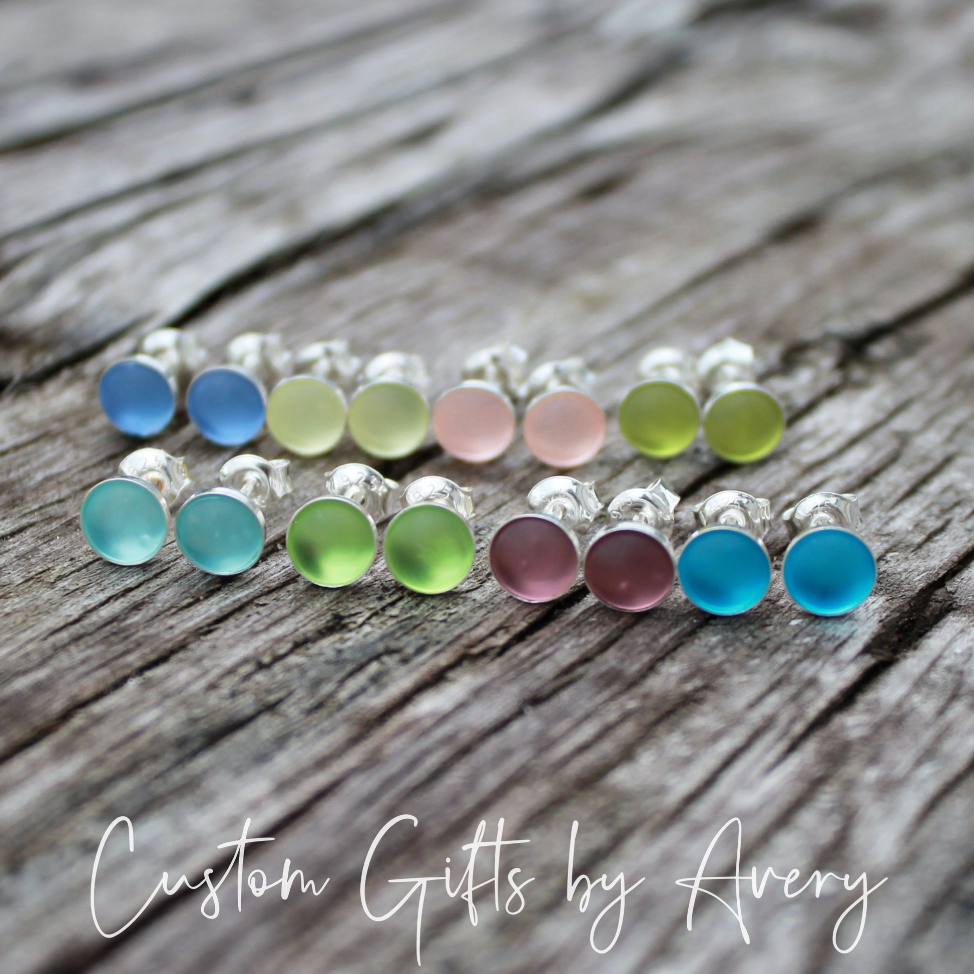 These cultured sea glass earrings are made with high-quality frosted glass that resembles ocean tumbled sea glass, but is consistent in shape, colour, and size and comes at a fraction of the price. These gorgeous little gems come in a variety of colours and are set into .925 sterling silver posts. They are secured with sterling silver ear nuts.