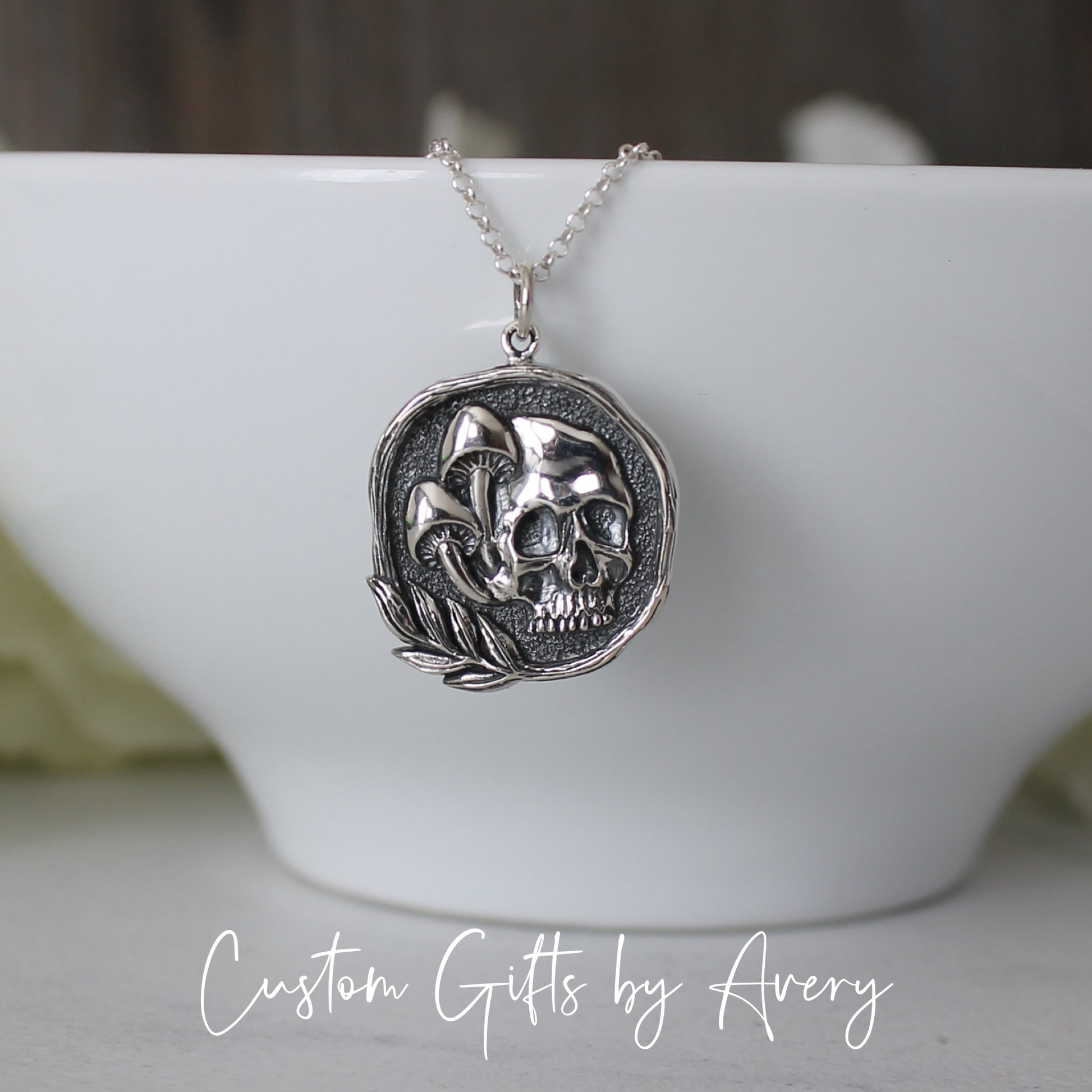 Sterling Silver Skull & Mushrooms Coin Necklace