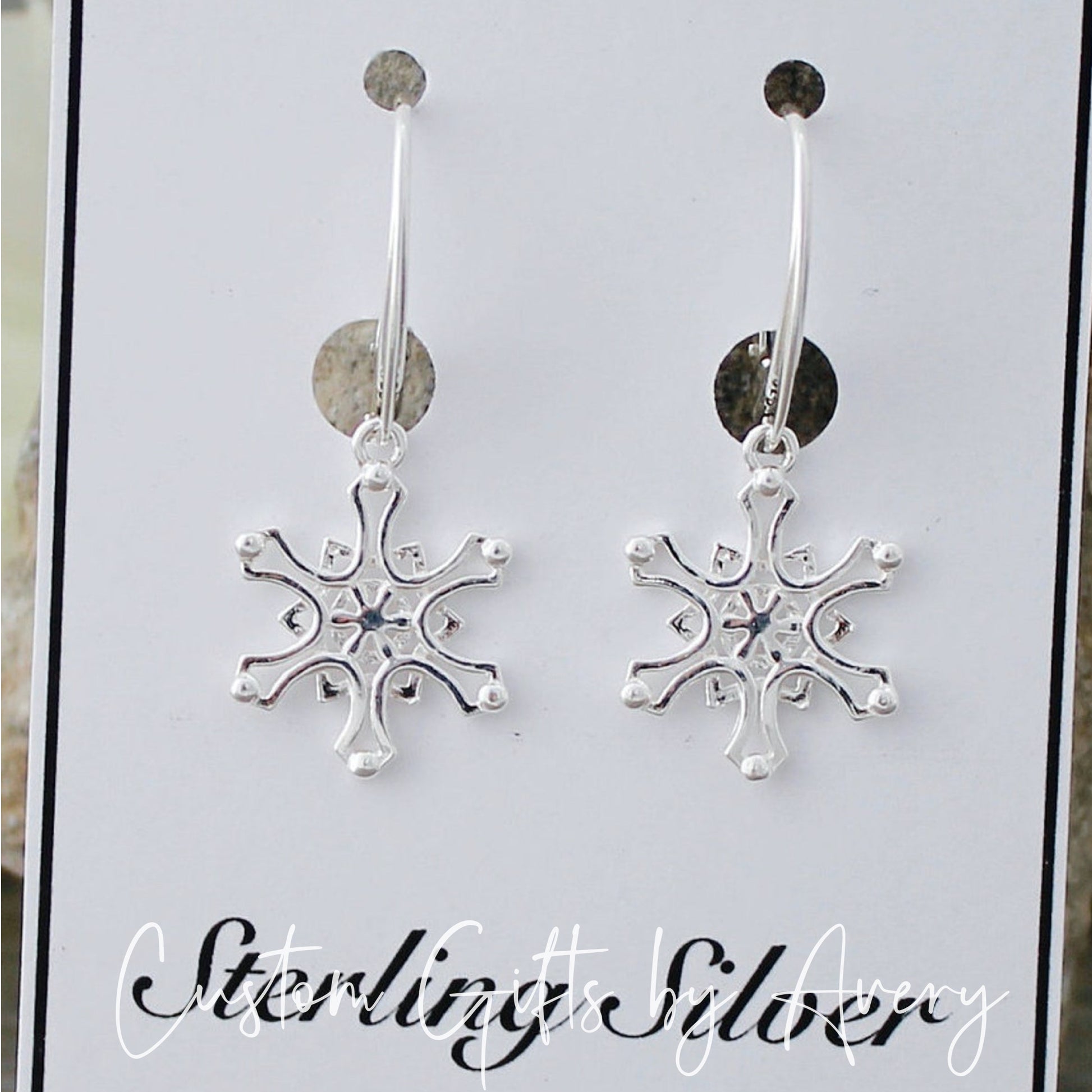 These solid .925 sterling silver snowflake earrings have a raised textured design. Choose between sterling silver fishhooks or sterling silver lever backs. Fishhooks come with small rubber backings to secure earrings. A sterling silver polishing cloth is included.