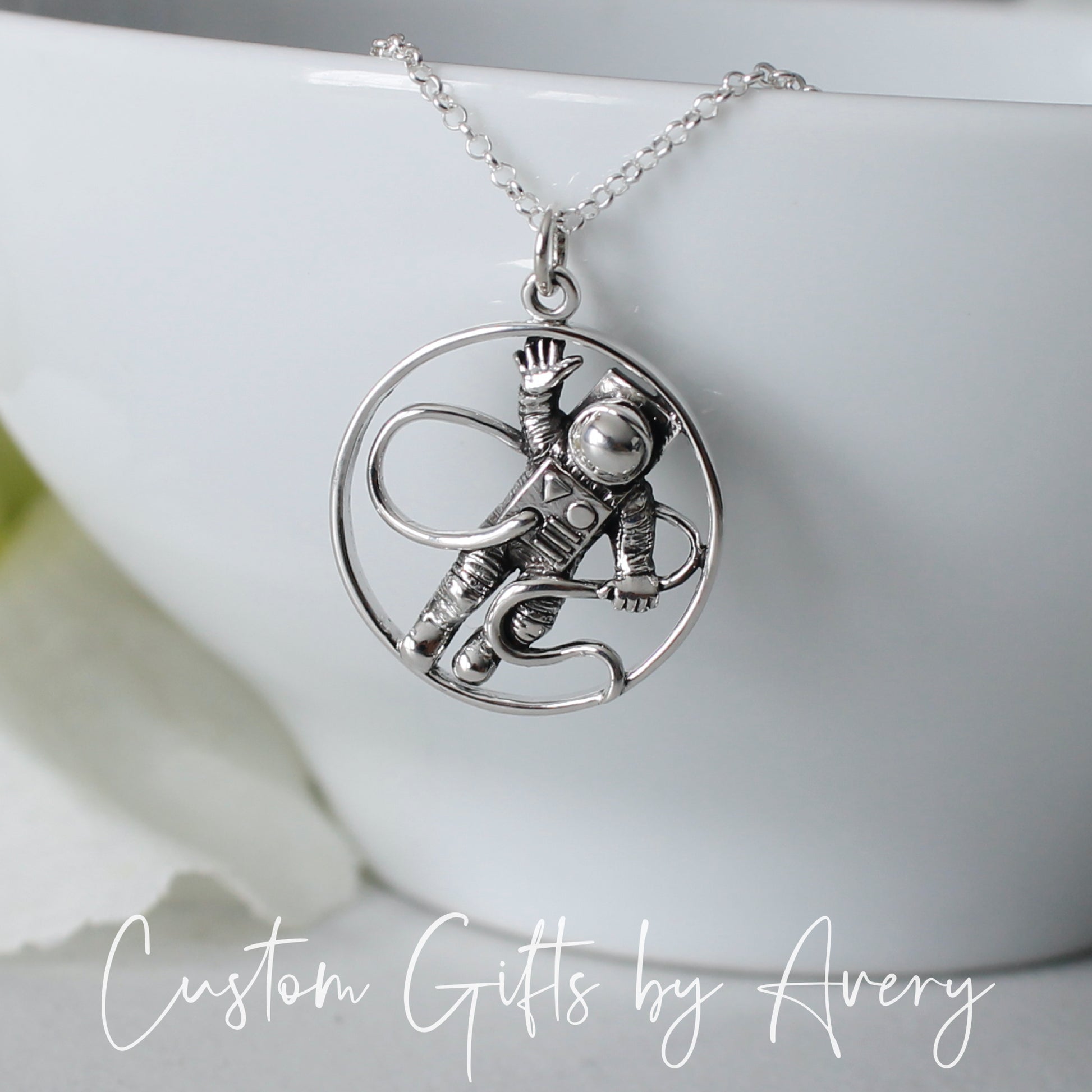 This sterling silver space astronaut necklace celebrates space exploration and mankind's dedication to discovery. Featuring an incredibly detailed astronaut in zero gravity, it reminds us all things are possible.