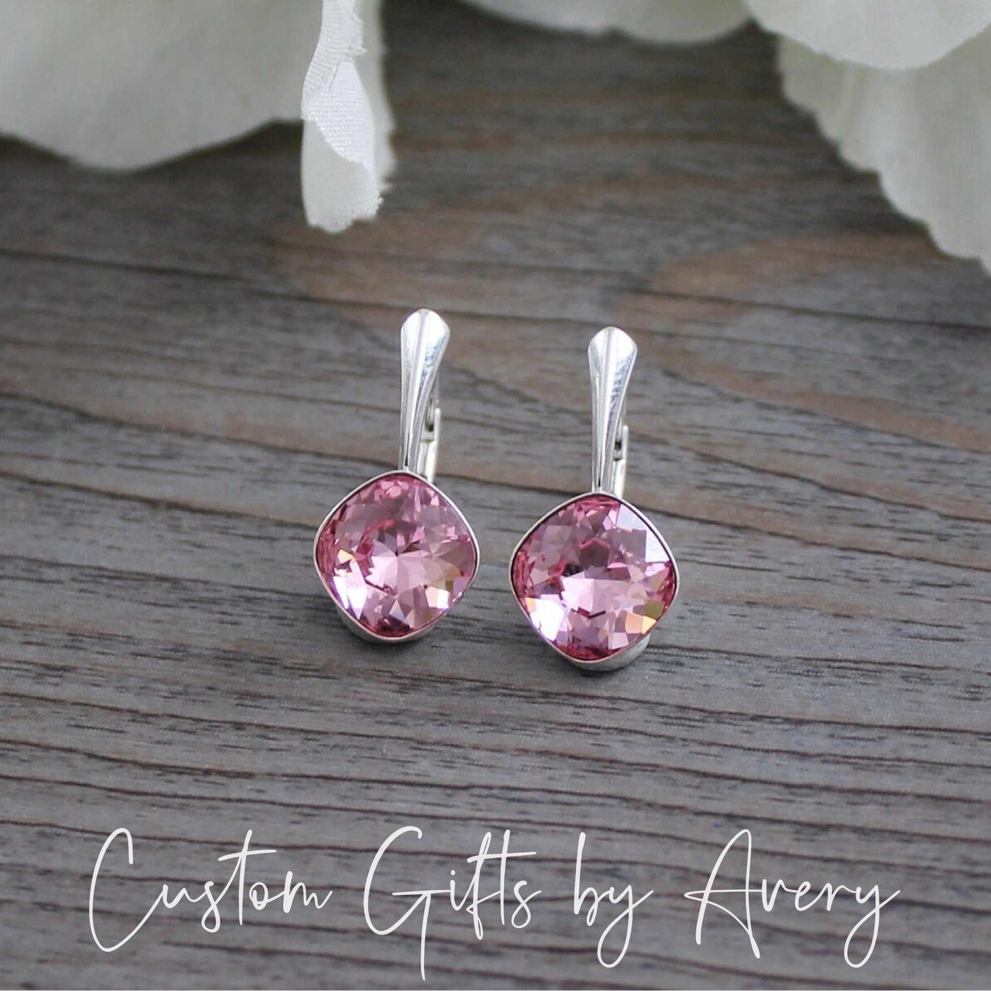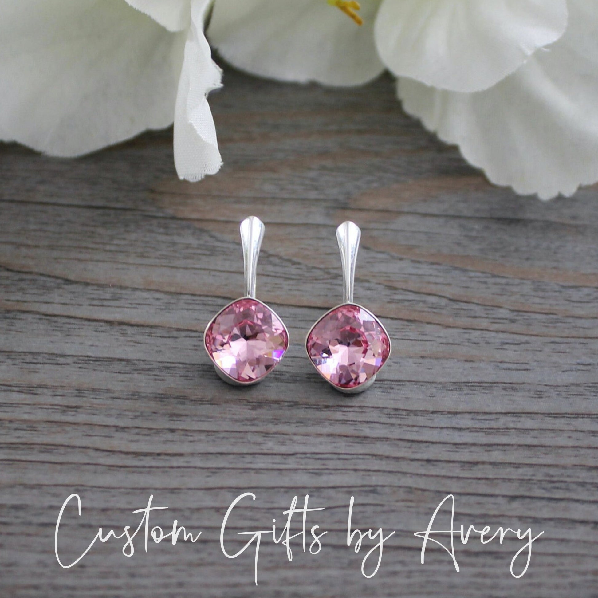 Sterling Silver Square Cut Austrian Crystal Earrings ~ Light Pink