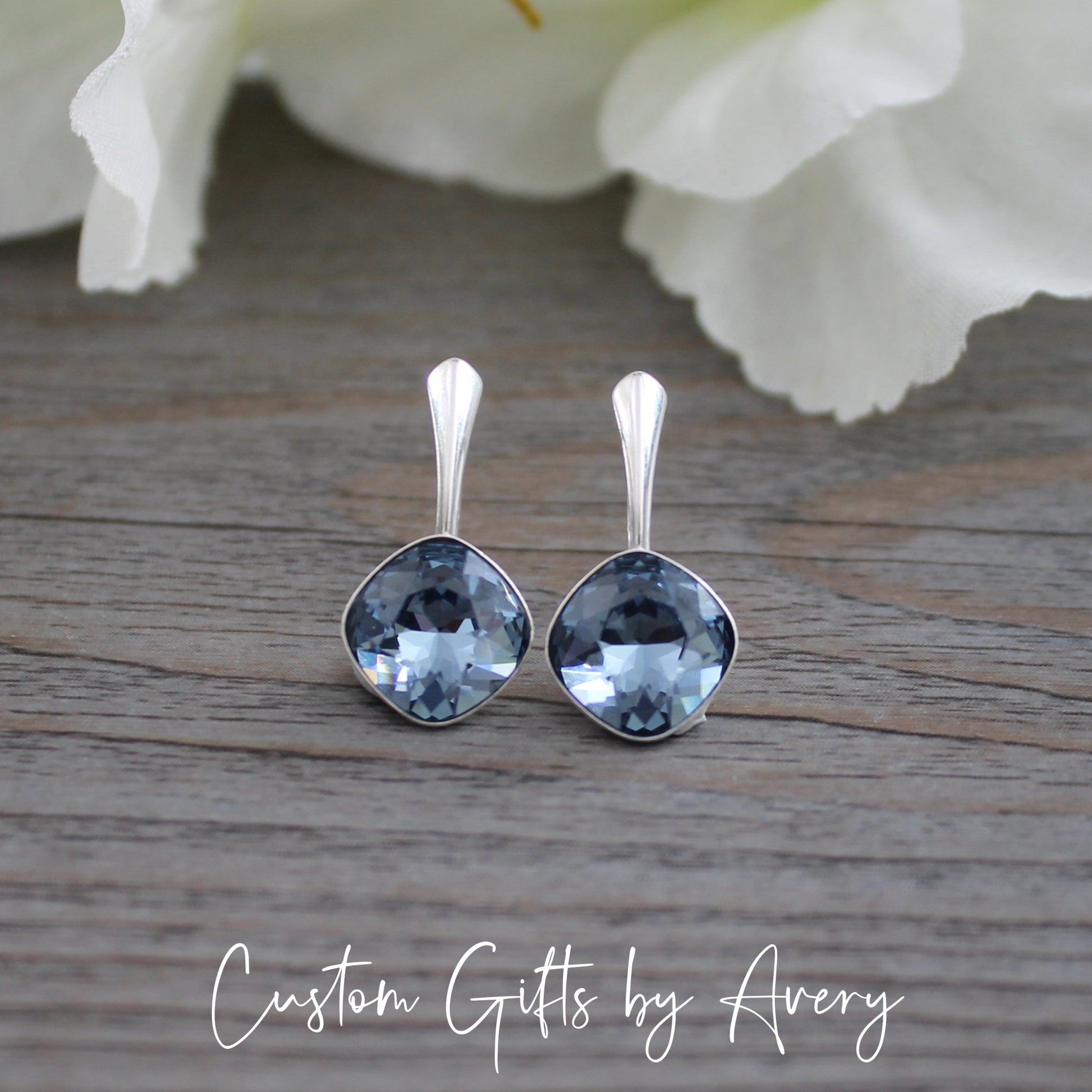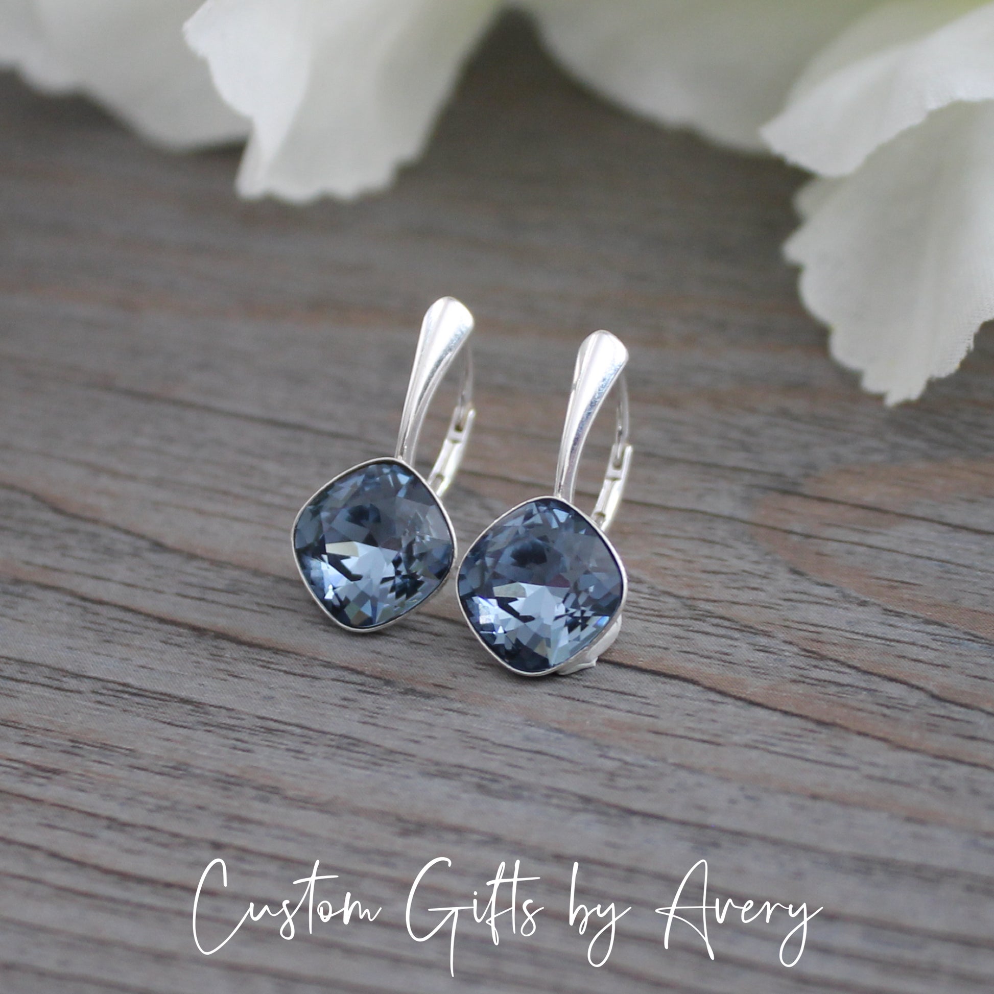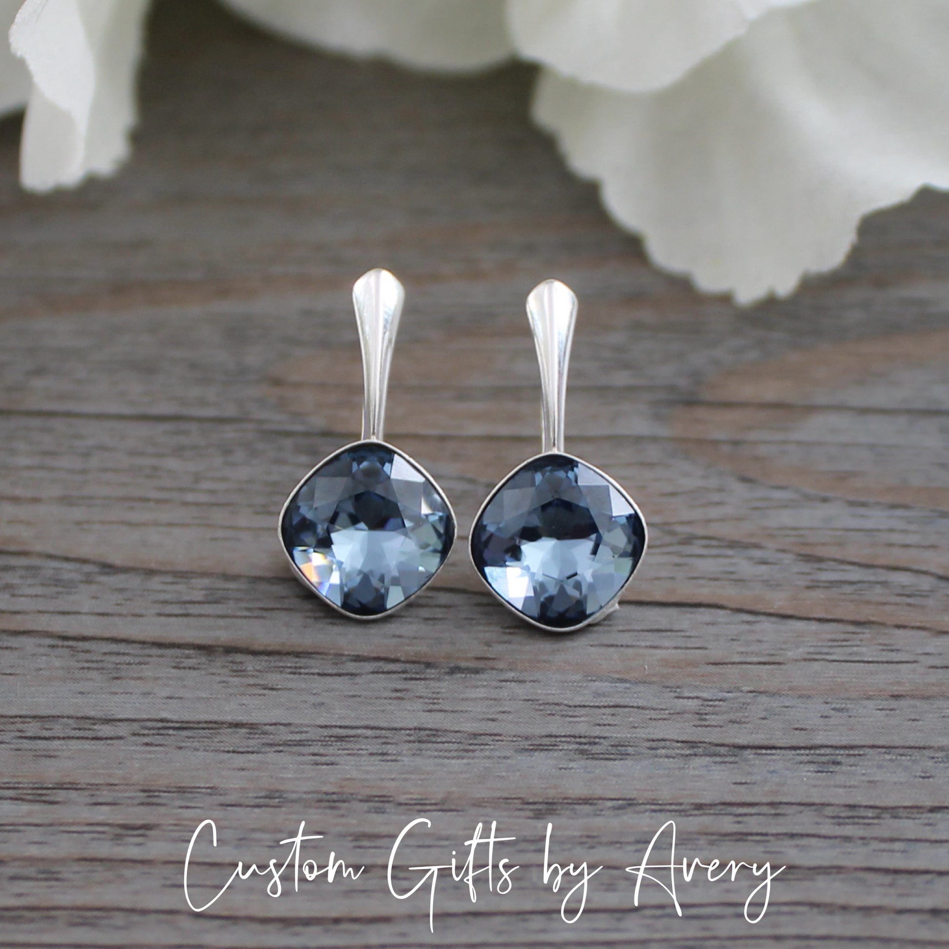 Sterling Silver Square Cut Austrian Crystal Earrings ~ Denim Blue