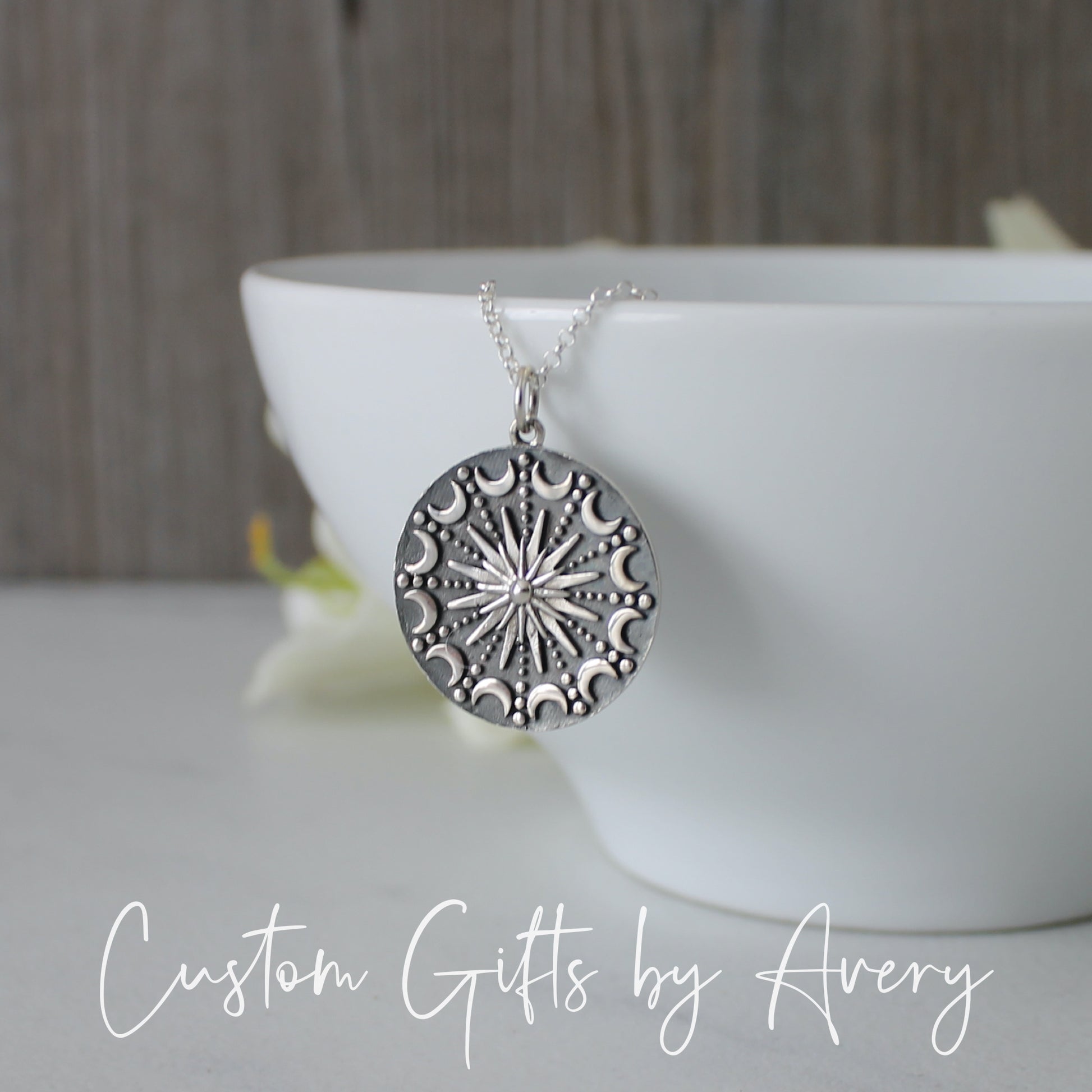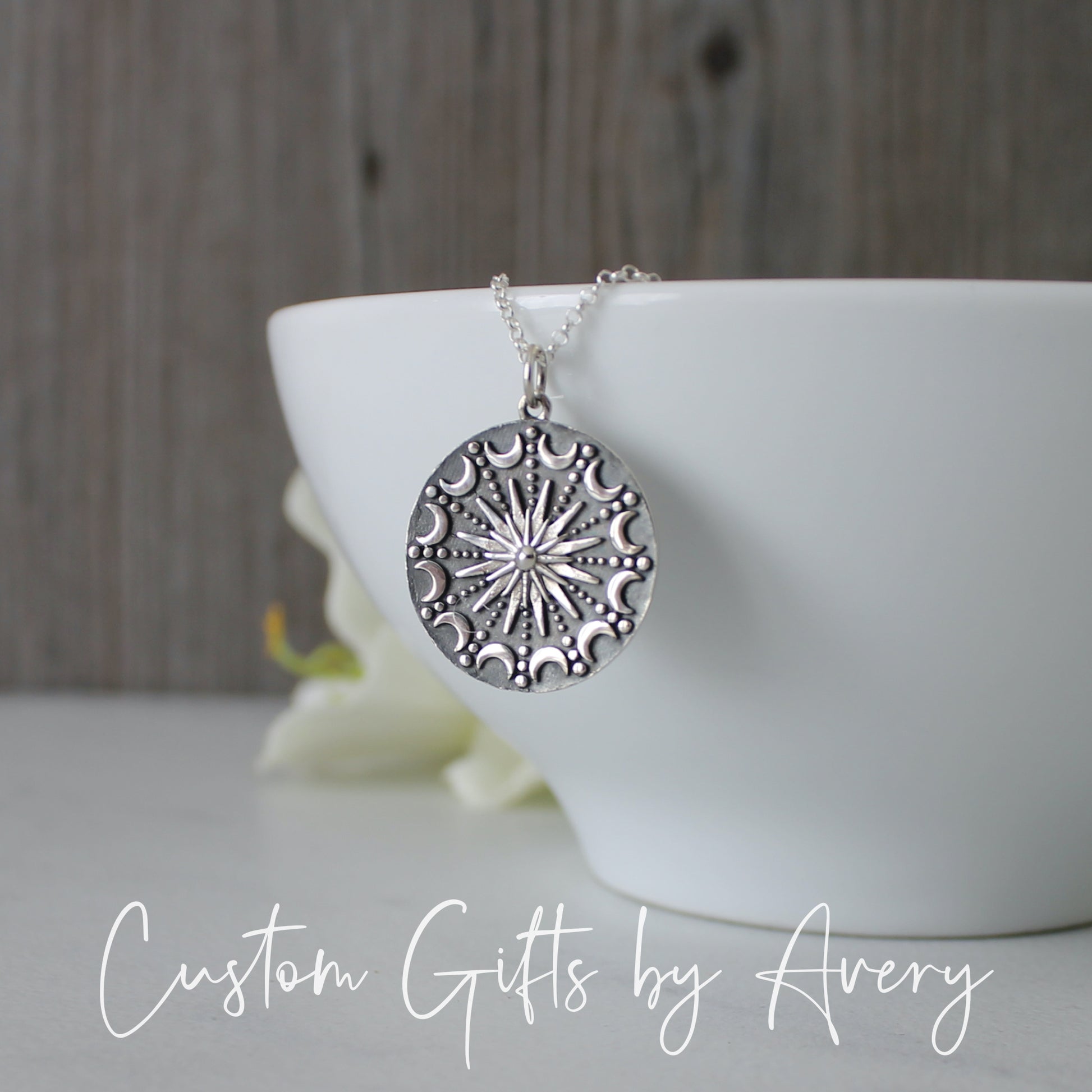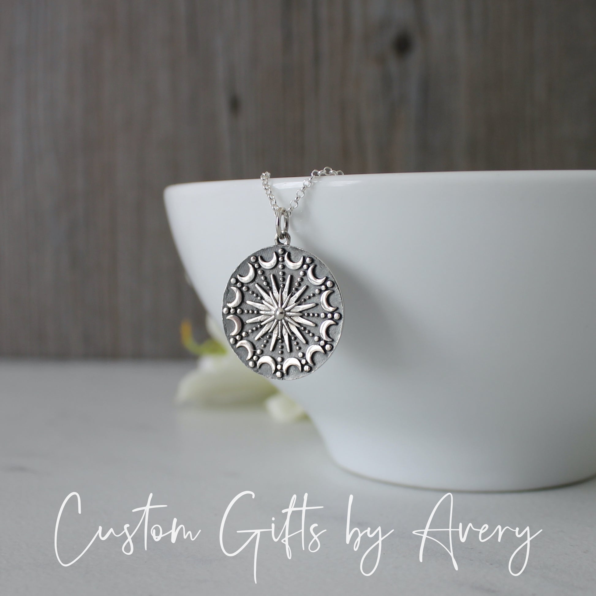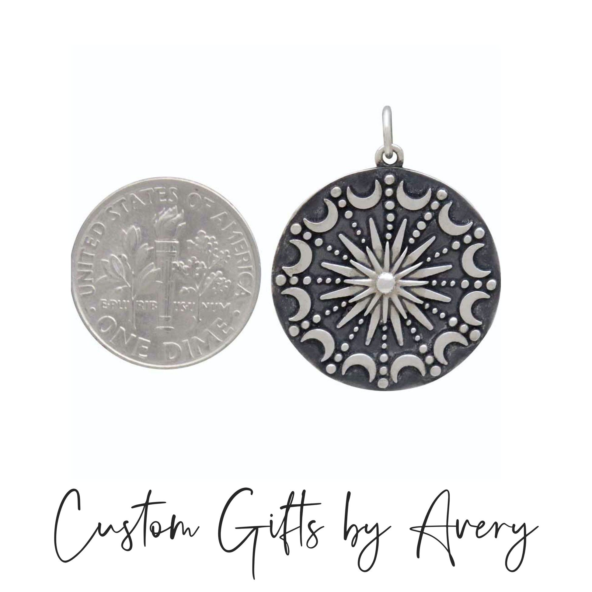 This etched and oxidized celestial mandala combines the power of the sun and moon. In the centre is a brightly polished, raised sun design. Arched around it are lunar phases shown as the moon waxes and wanes.