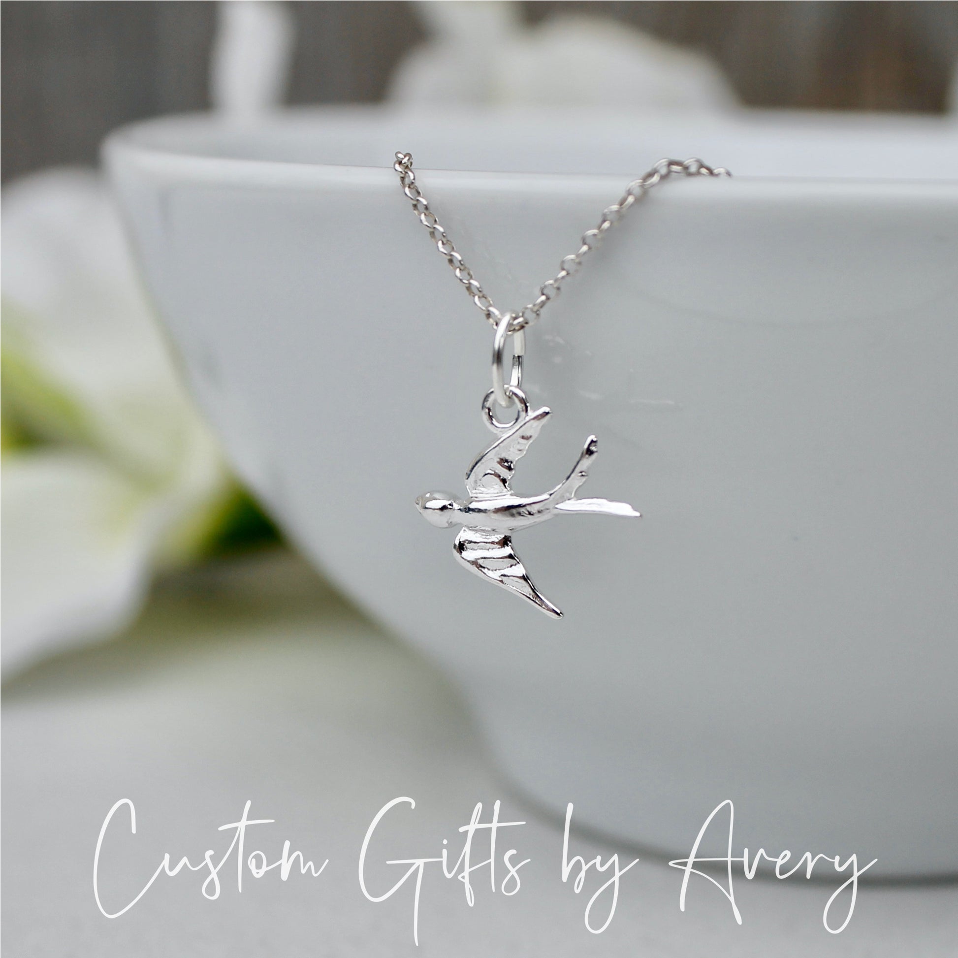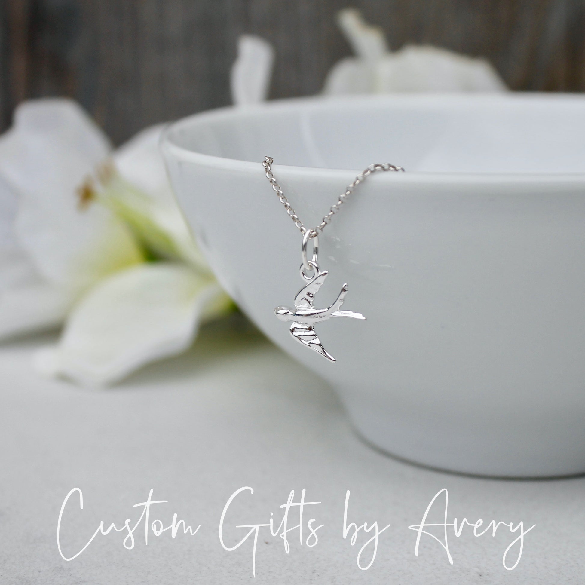 This petite flying swallow necklace hangs suspended in flight. It is lightweight and perfect for everyday wear. This swallow is double sided - with the front the front having texture on the wings, and the 'back' having a smooth detailing.