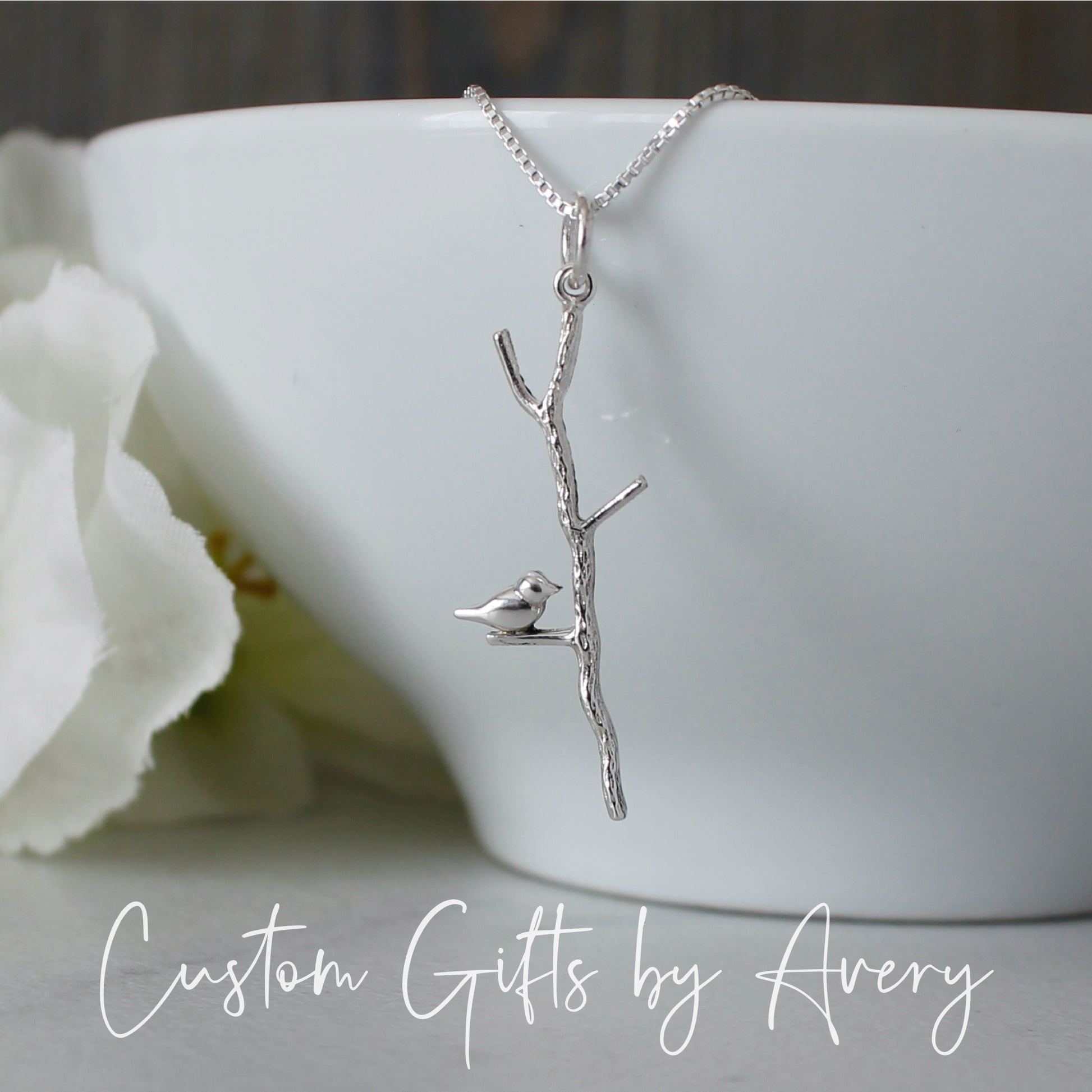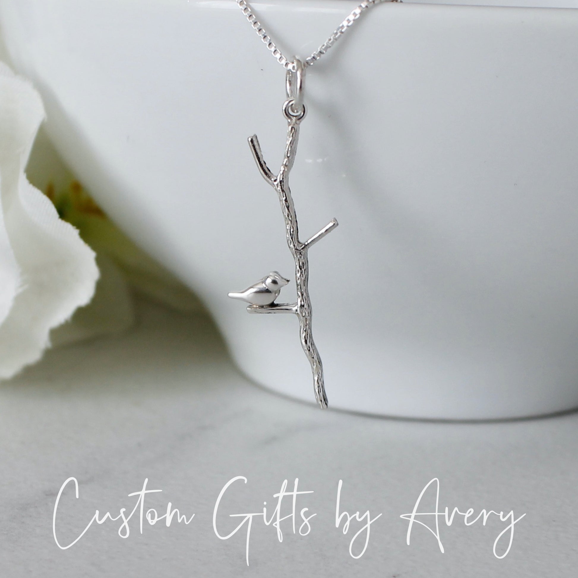 Crafted in solid .925 sterling silver, this dainty bird sits on a twiggy branch.
