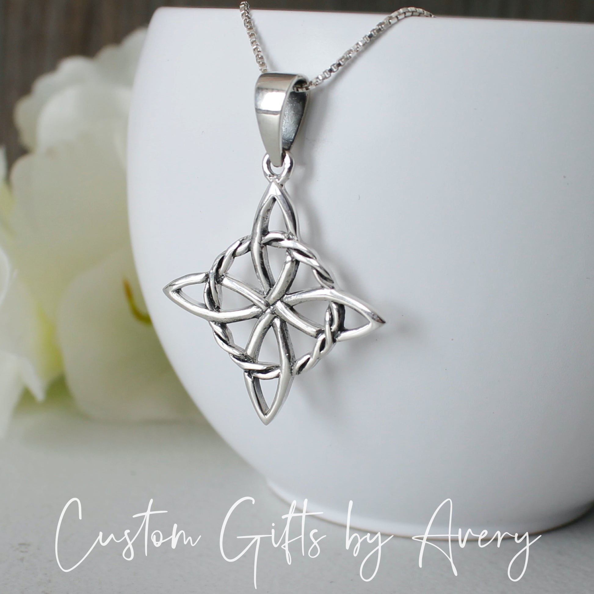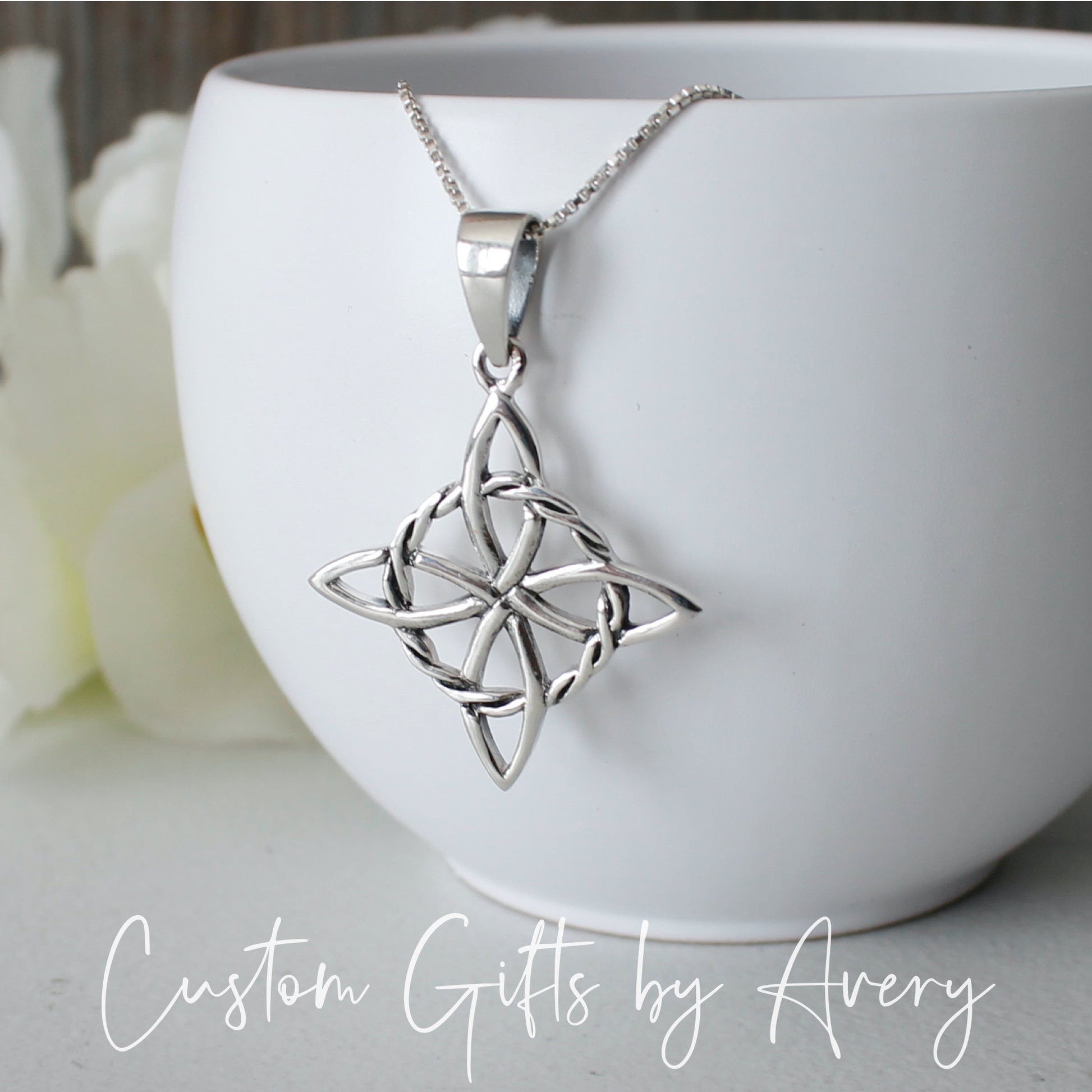 Crafted in sterling silver, this witch's knot is a protective amulet that is made up of two intertwined symbols. The first of these is the circle, the universal symbol of life, the universe and eternal things, and the four-cornered Gaelic knot. This is a heavier witches knot pendant made from approximately 4.7 grams of silver.