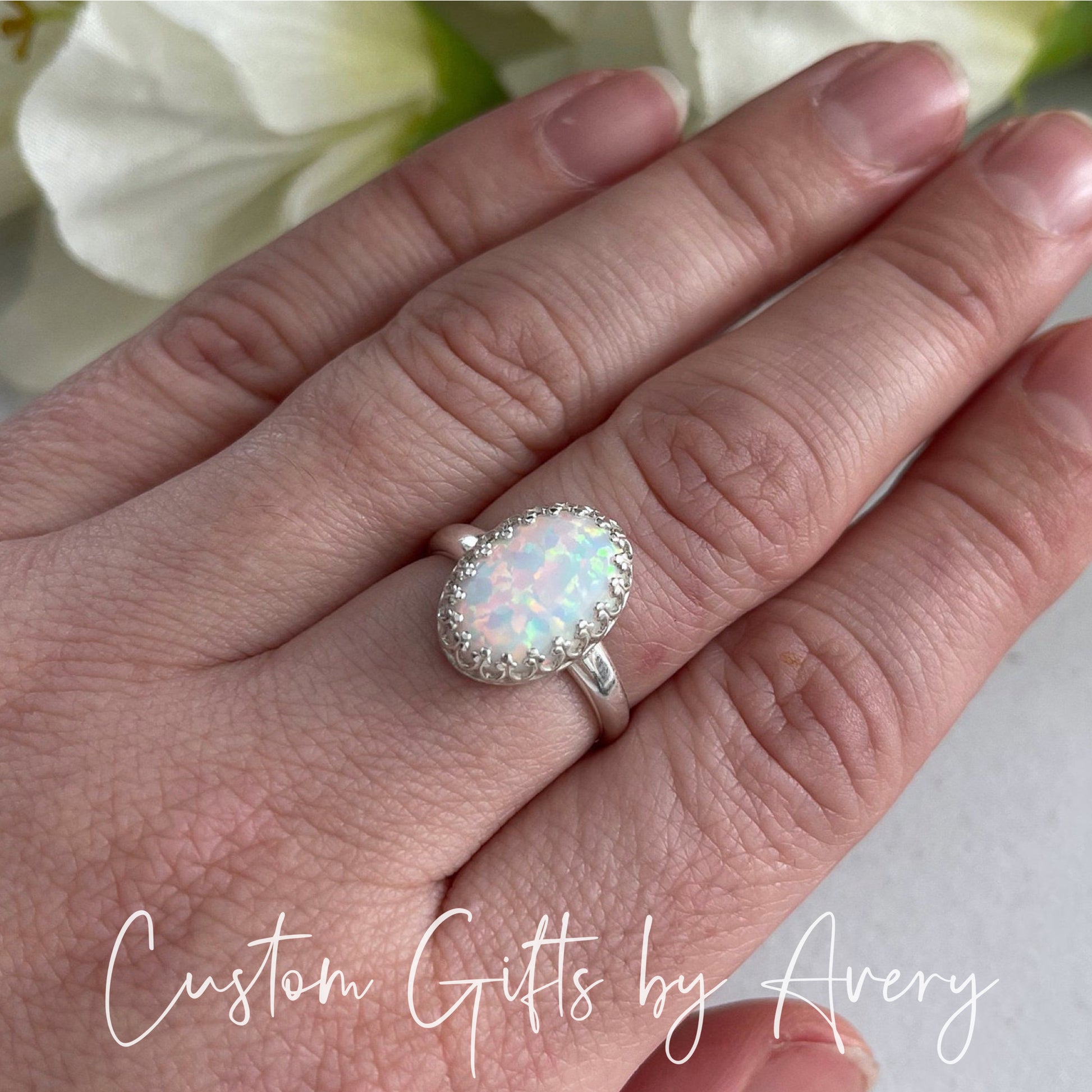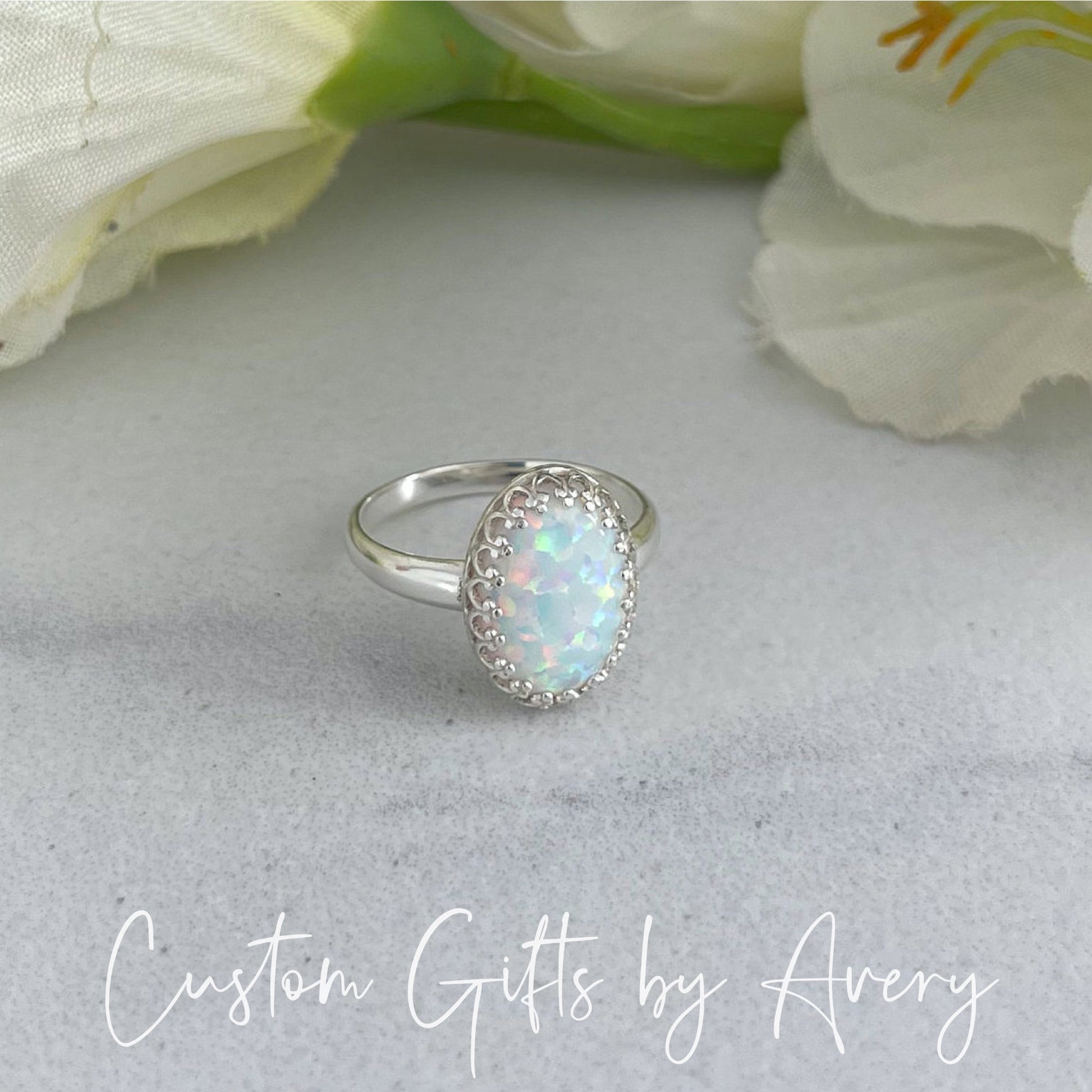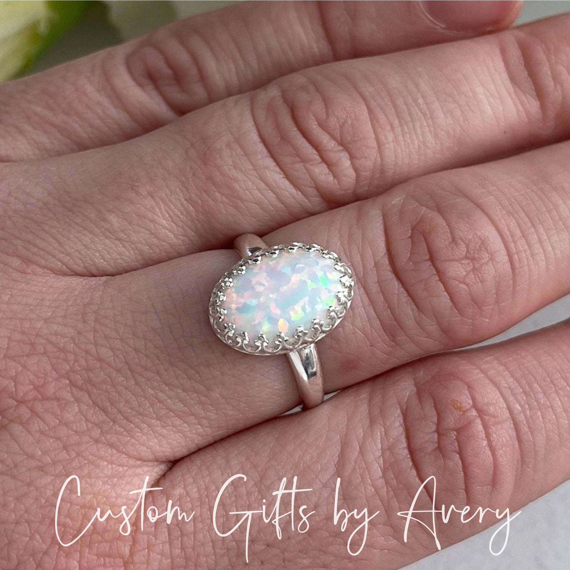 An absolutely gorgeous white opal gemstone ring. This victorian style sterling silver setting showcases a large 14x10mm oval opal. The pinfire in this opal is beautiful in the light and flashes a multitude of colours. This ring makes a beautiful gift for those born in October, or anyone who loves the beauty of a classic opal.