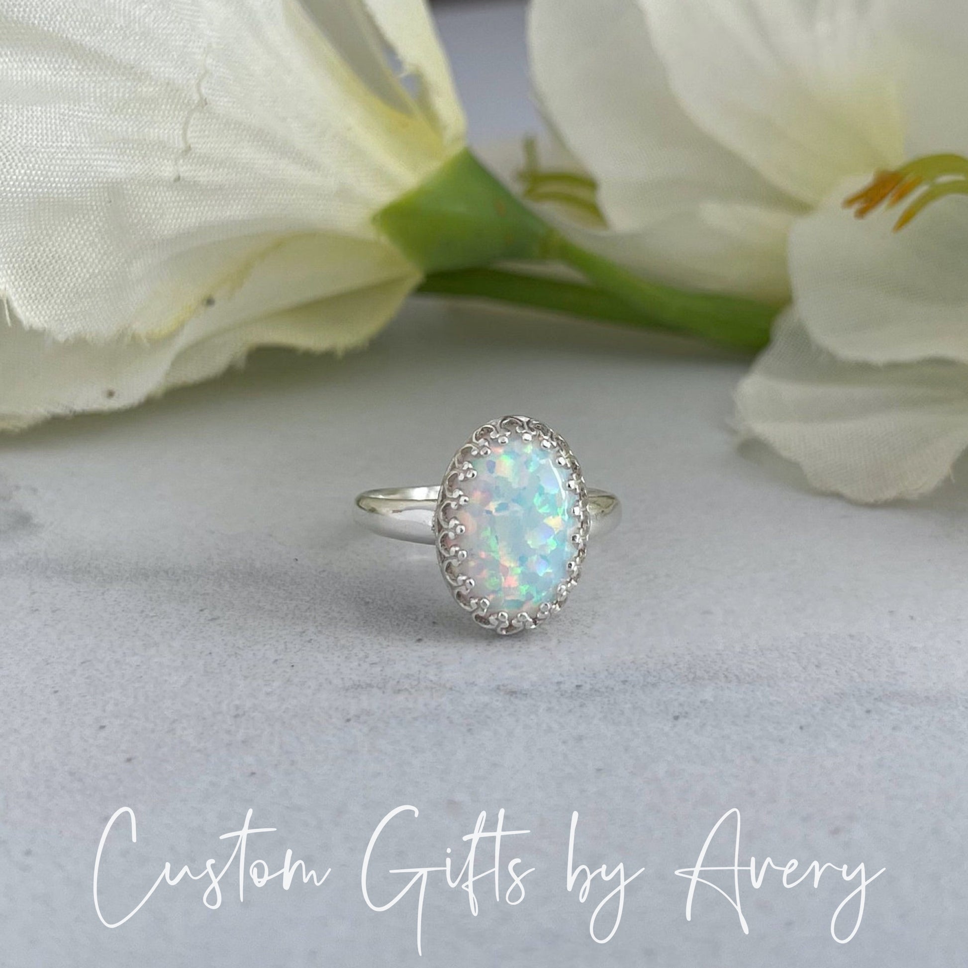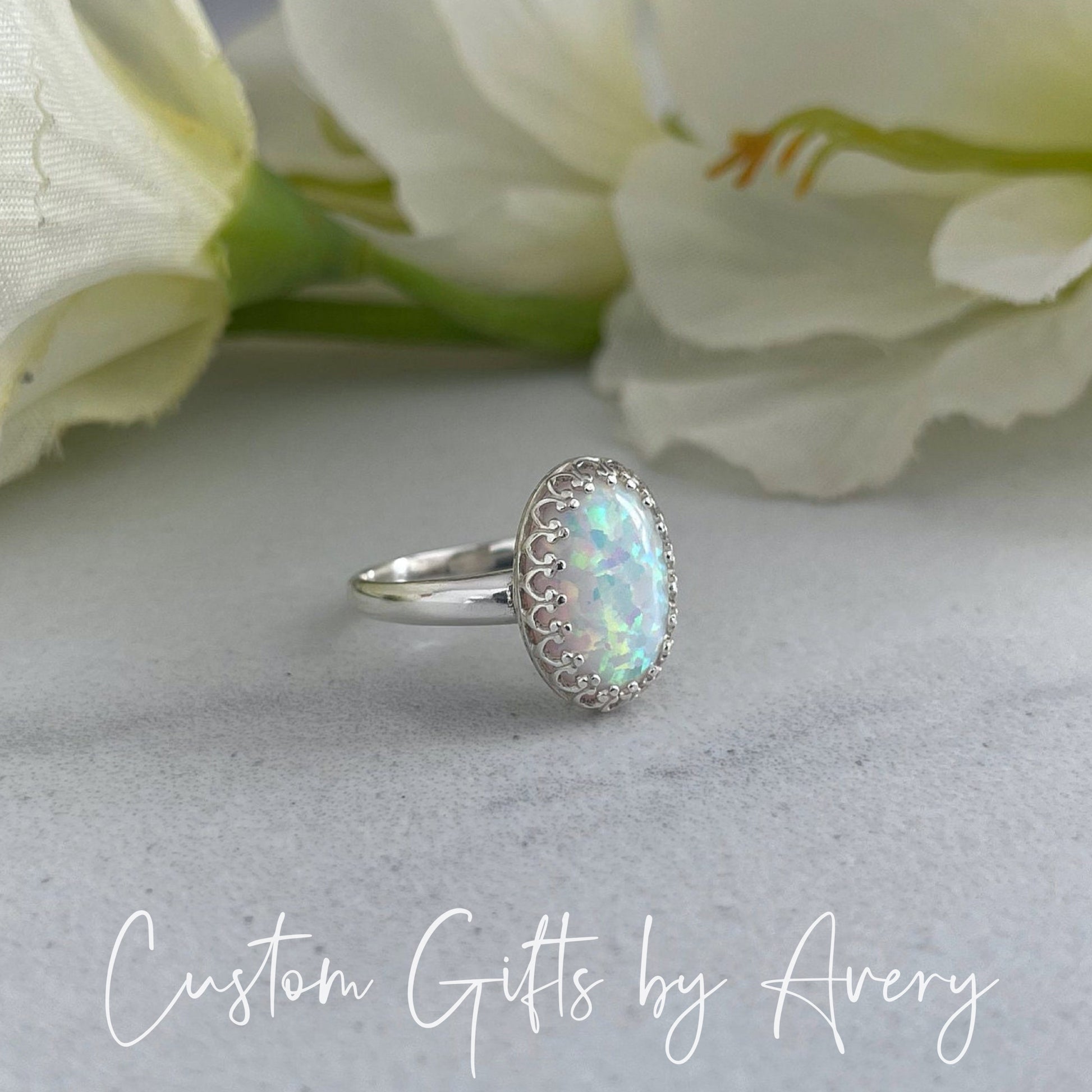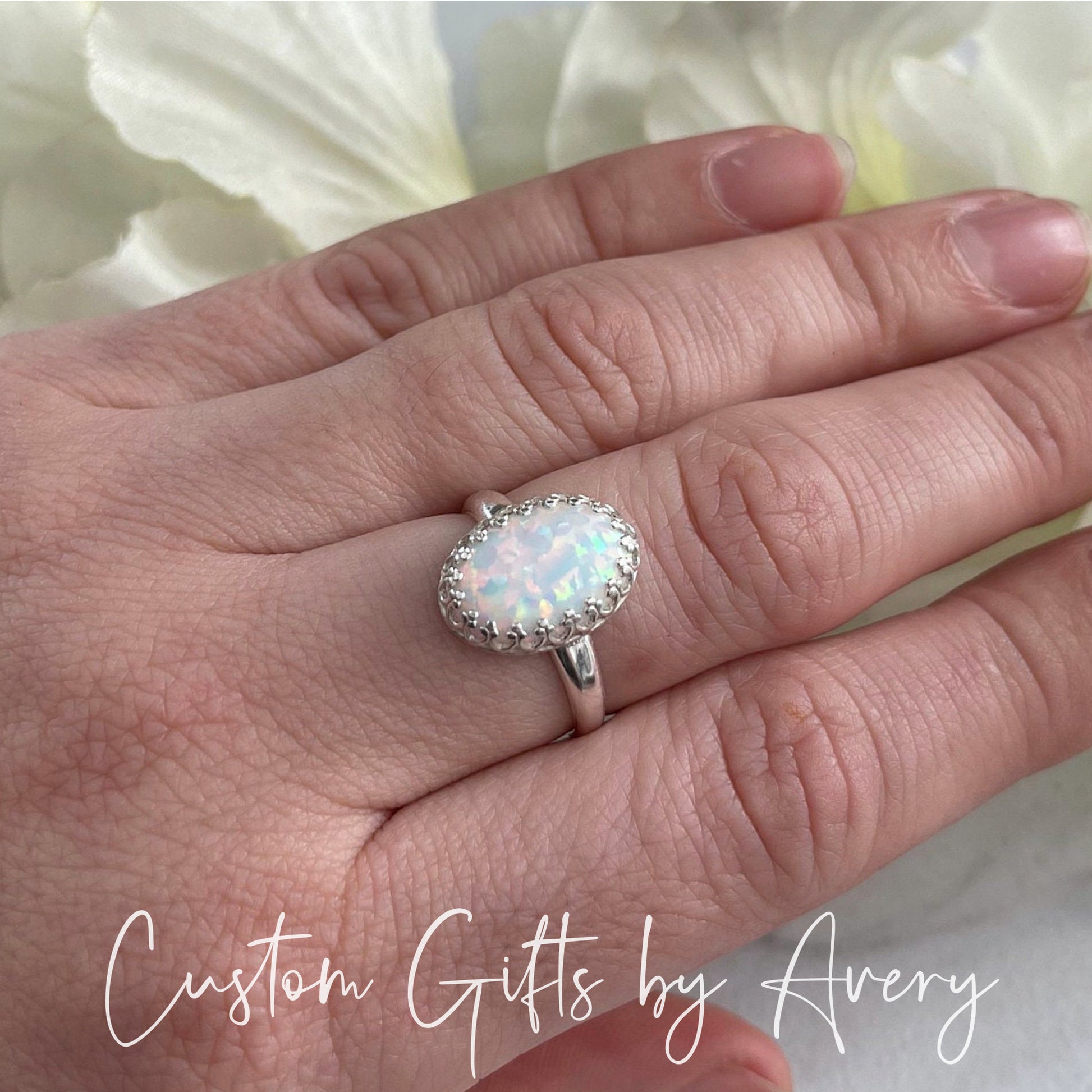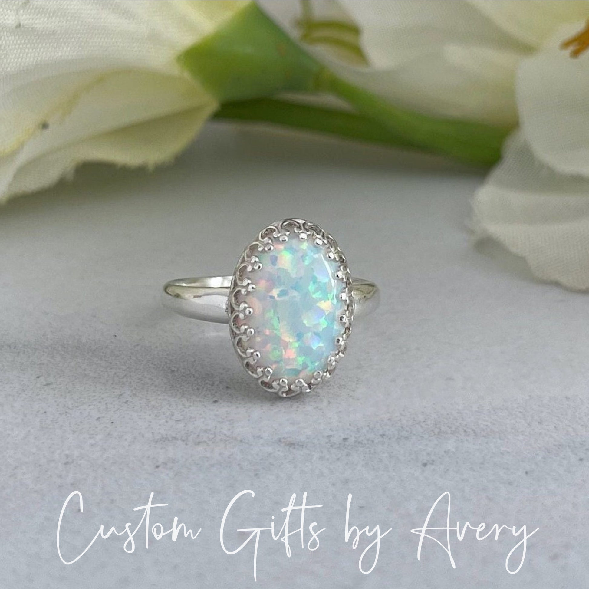 An absolutely gorgeous white opal gemstone ring. This victorian style sterling silver setting showcases a large 14x10mm oval opal. The pinfire in this opal is beautiful in the light and flashes a multitude of colours. This ring makes a beautiful gift for those born in October, or anyone who loves the beauty of a classic opal.