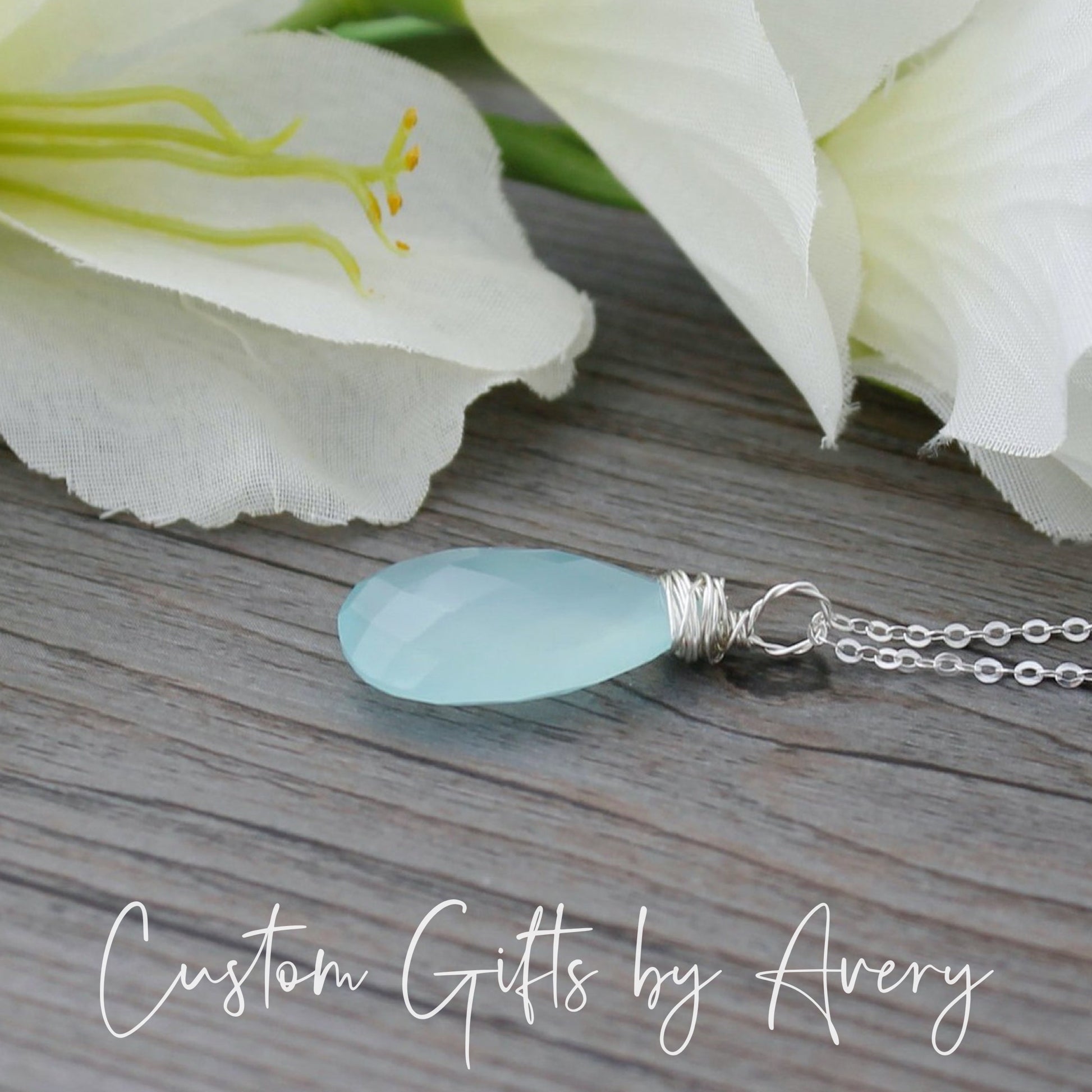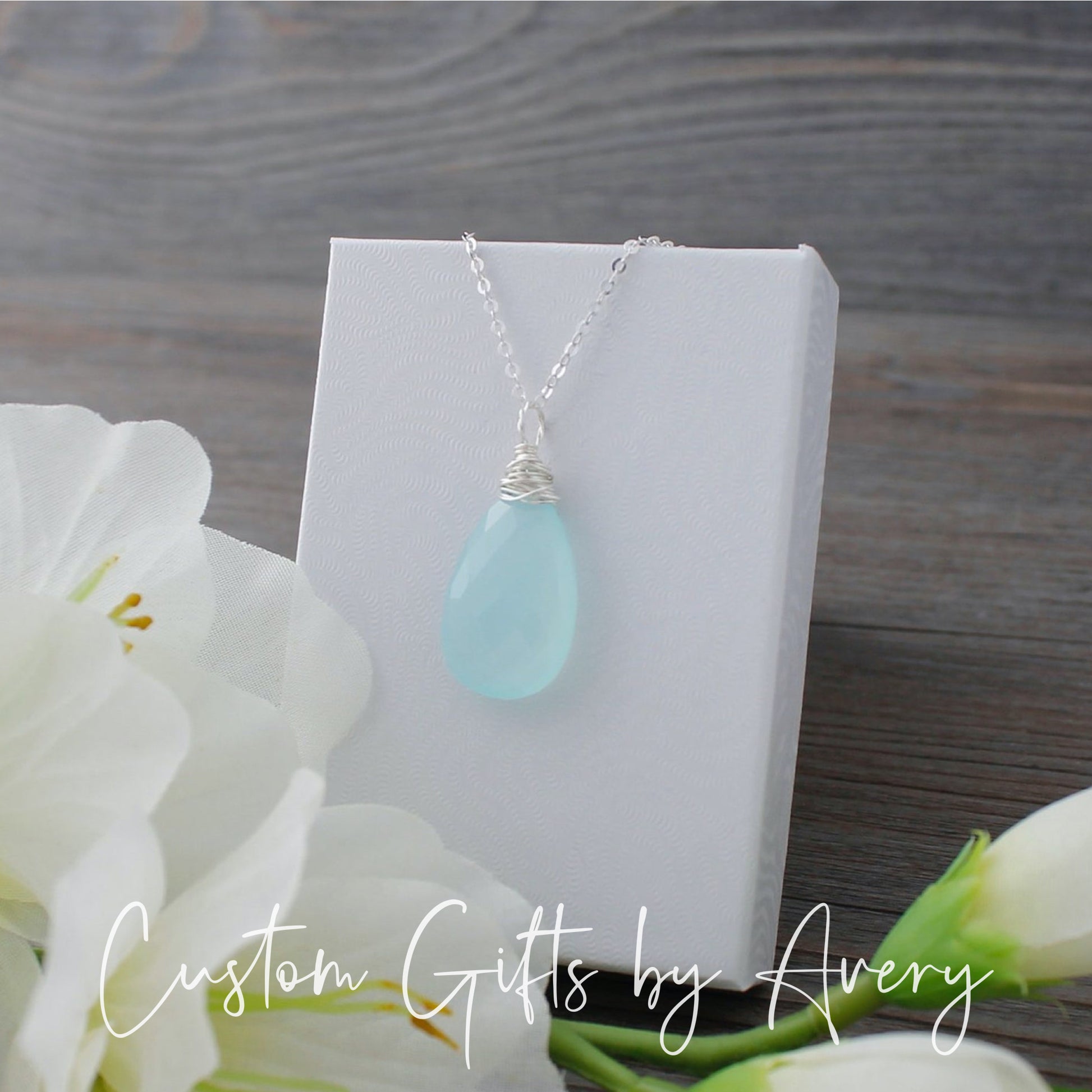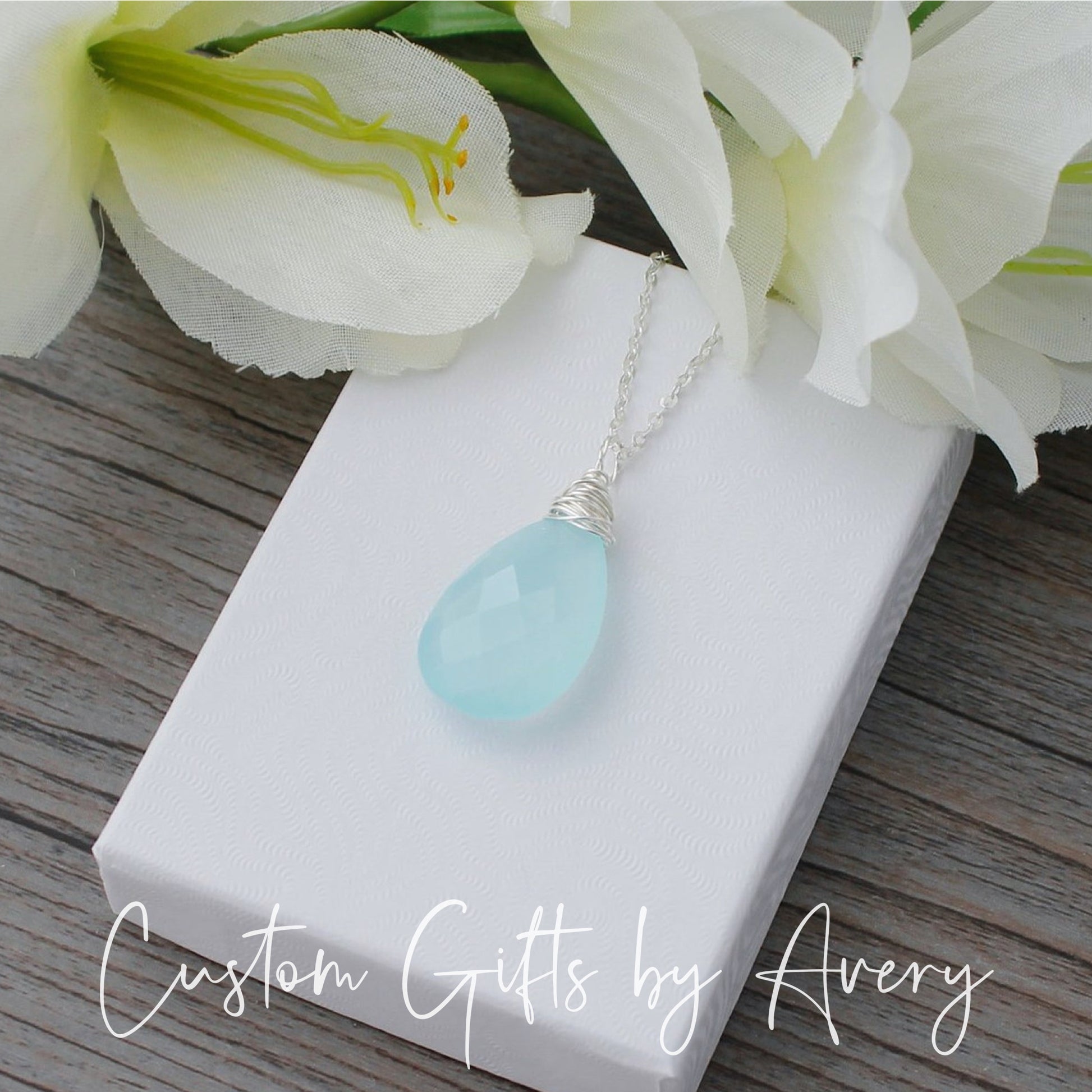 Sterling Silver Wire-Wrapped Aqua Chalcedony Teardrop Necklace