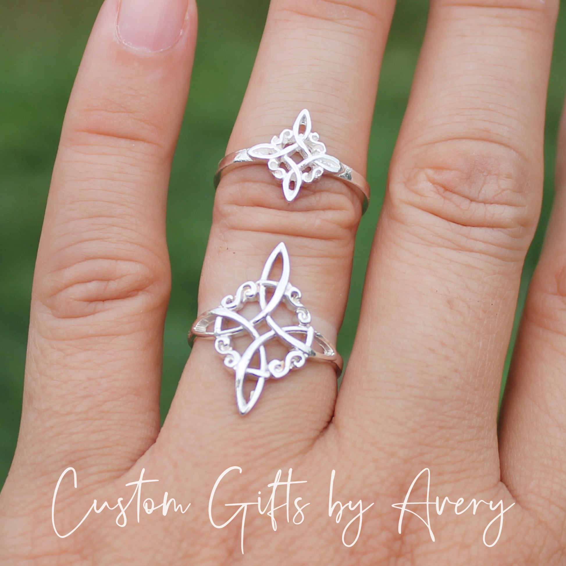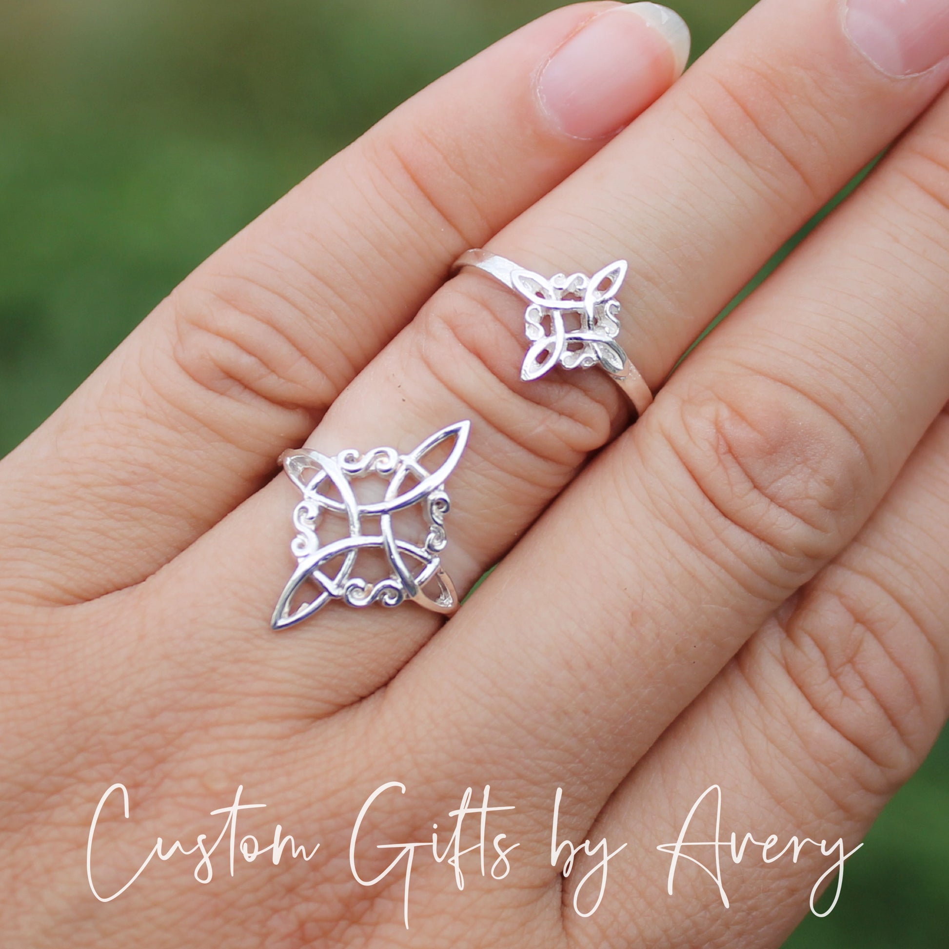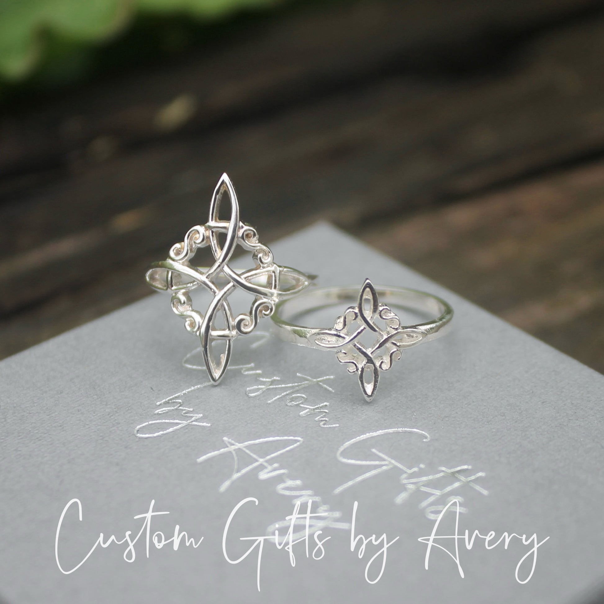 Crafted in sterling silver, this witch's knot ring is a protective amulet that is made up of two intertwined symbols. The first of these is the circle, the universal symbol of life, the universe and eternal things, and the four-cornered Gaelic knot. This ring comes in 2 knot sizes, small for those who want a more delicate look, and large for those who prefer more of a statement.