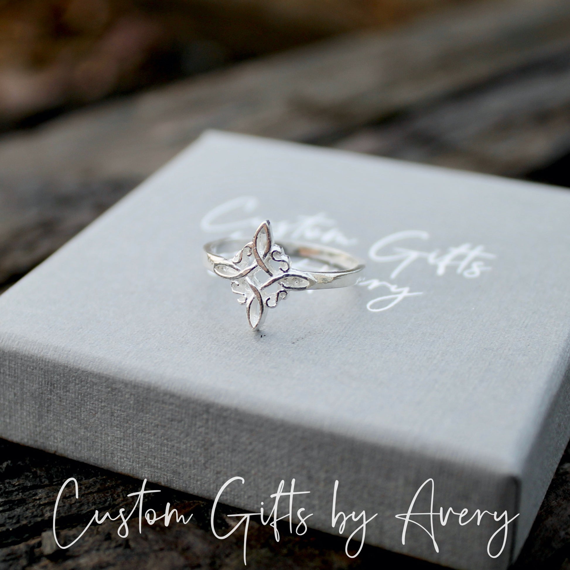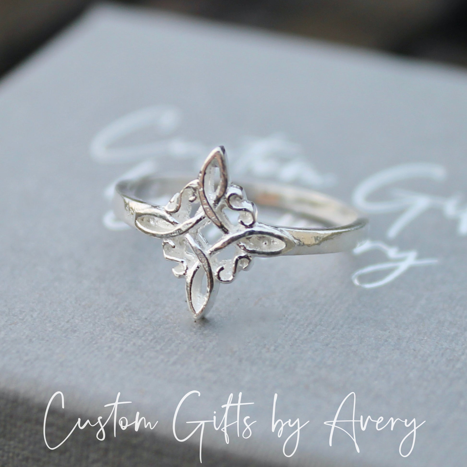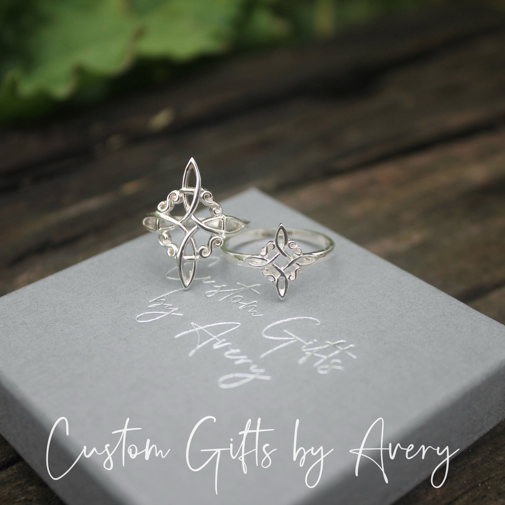 Crafted in sterling silver, this witch's knot ring is a protective amulet that is made up of two intertwined symbols. The first of these is the circle, the universal symbol of life, the universe and eternal things, and the four-cornered Gaelic knot. This ring comes in 2 knot sizes, small for those who want a more delicate look, and large for those who prefer more of a statement.