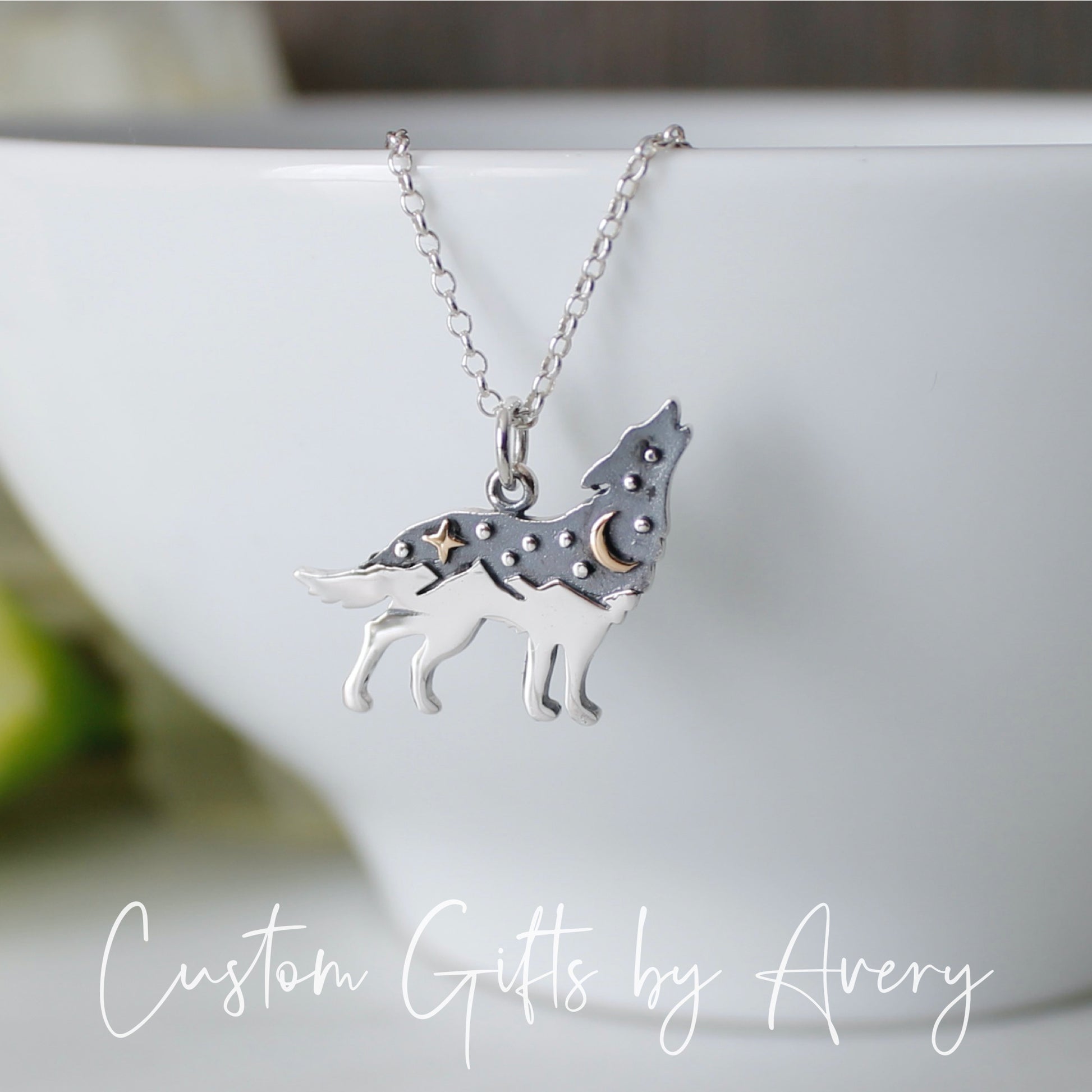 Sterling Silver Wolf & Night Mountain Sky Necklace