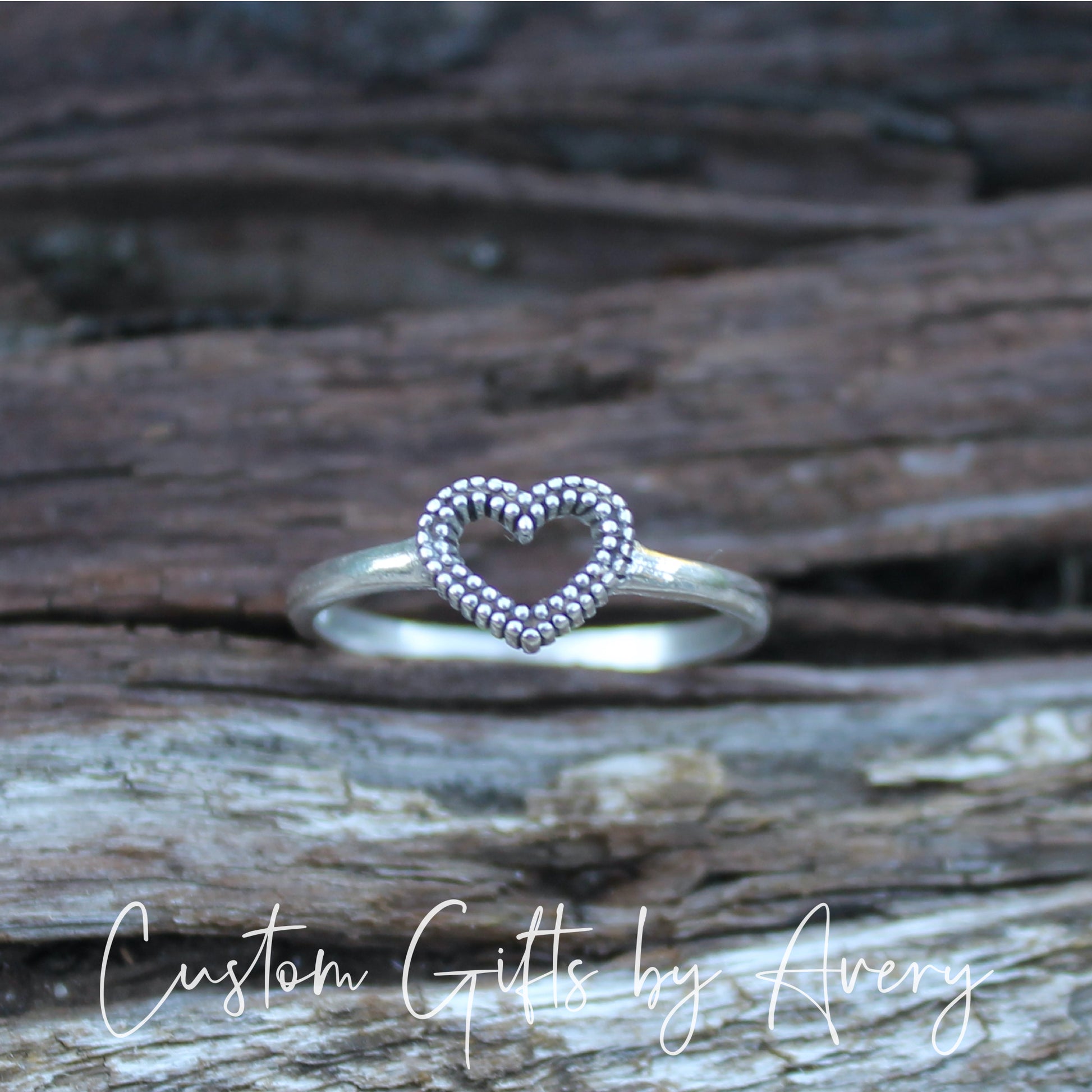 Crafted in oxidized sterling silver, this beaded open heart ring can be worn on it's own for a minimalist look or stacked with others for a more dramatic look.
