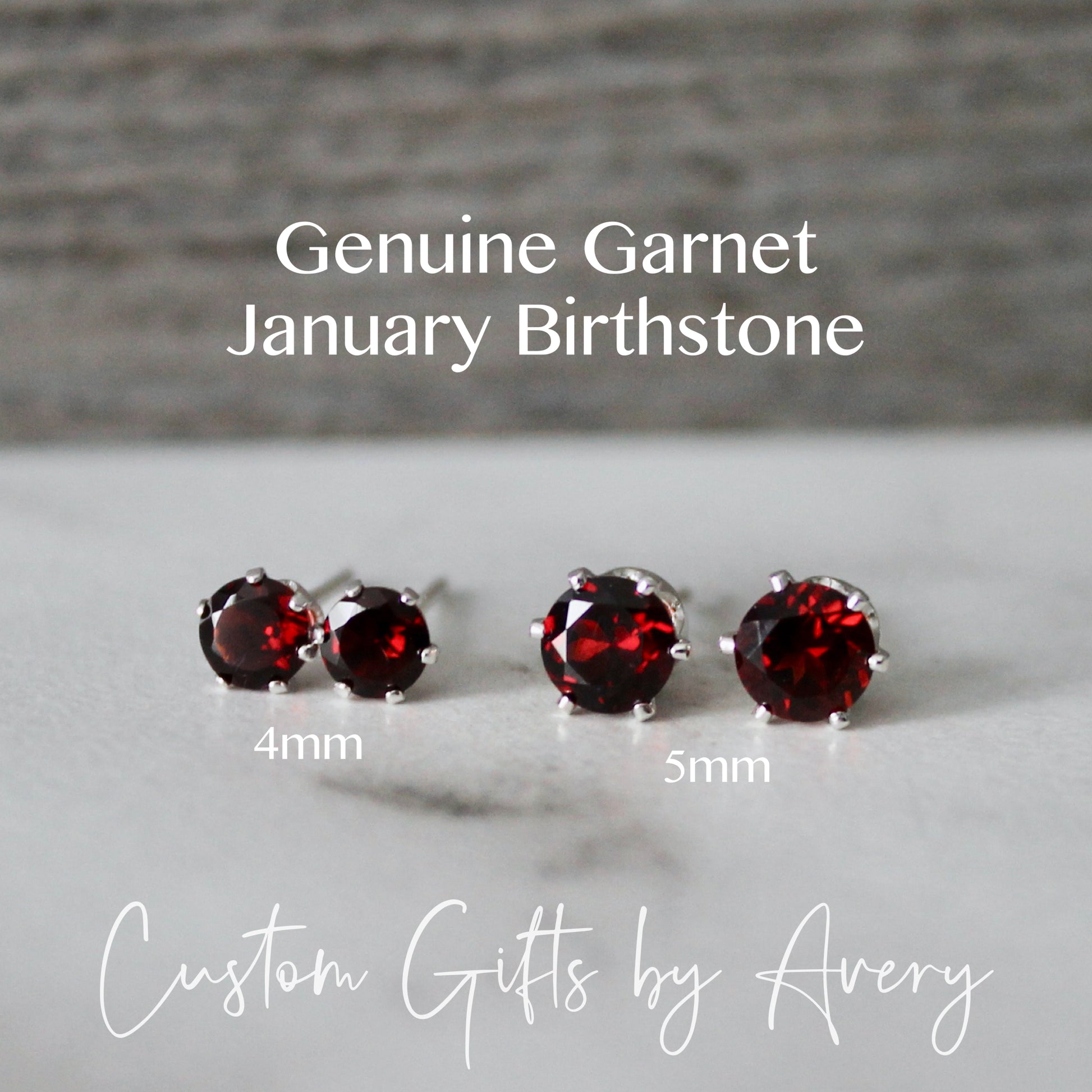 Simple & Elegant - natural red garnet gemstone studs. These beautiful deep red gems are set in classic .925 sterling silver 6 prong settings with matching silver butterfly scrolls fasteners.
