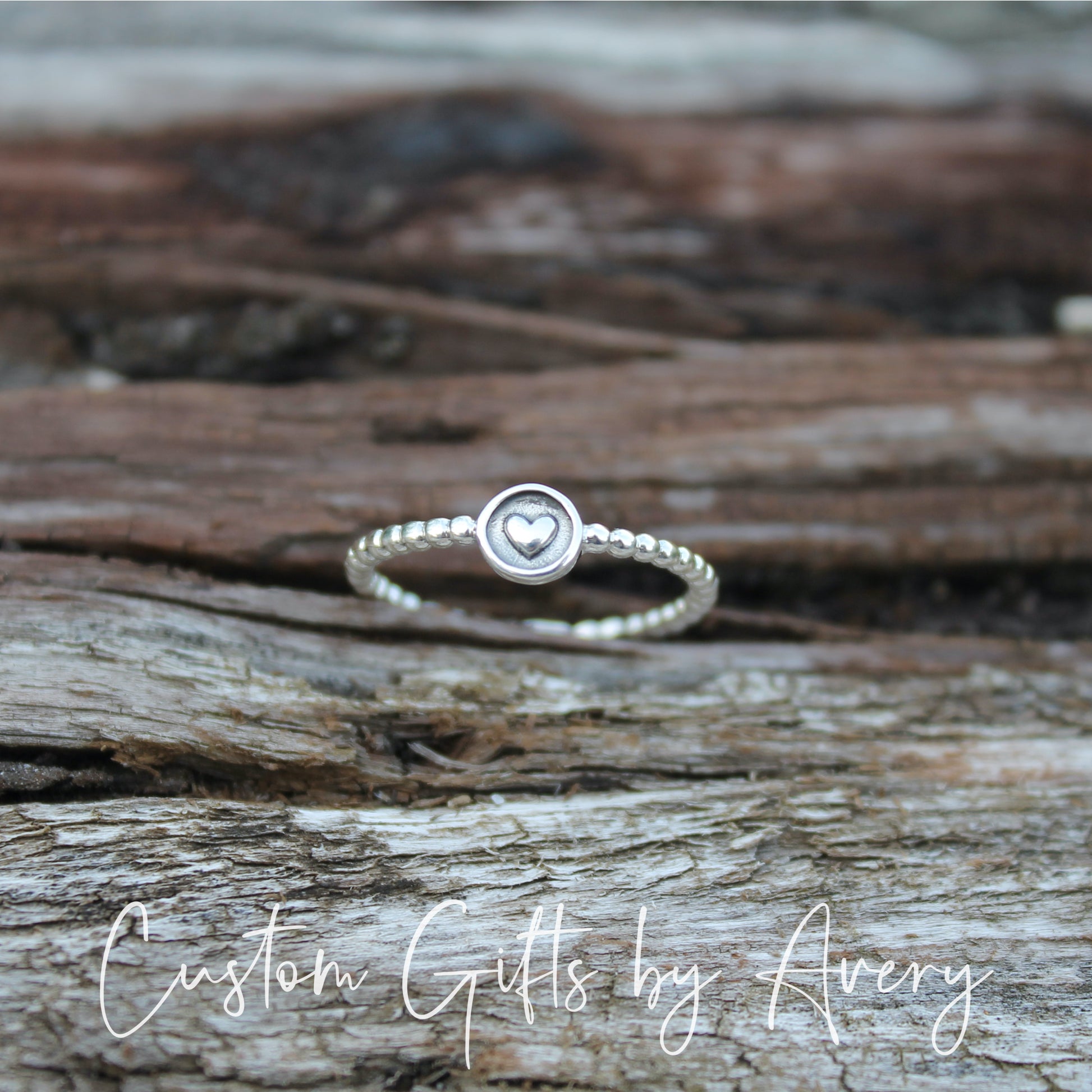 Crafted in oxidized sterling silver, this tiny heart ring is perfect for stacking. The raised polished heart is beautifully contrasted from the oxidized silver shadowbox background. Complete with beaded band, this is a simple but attractive ring.