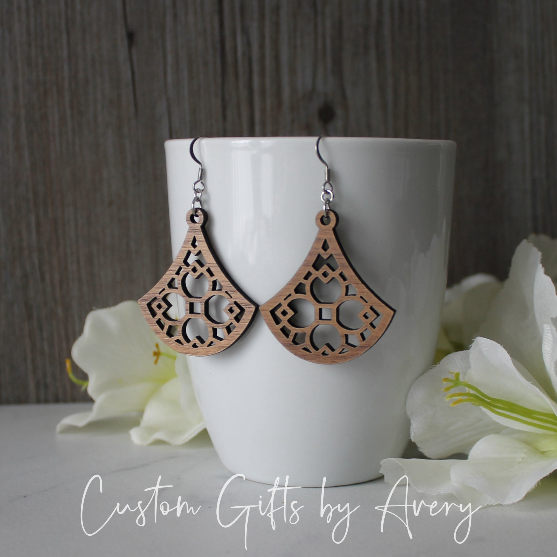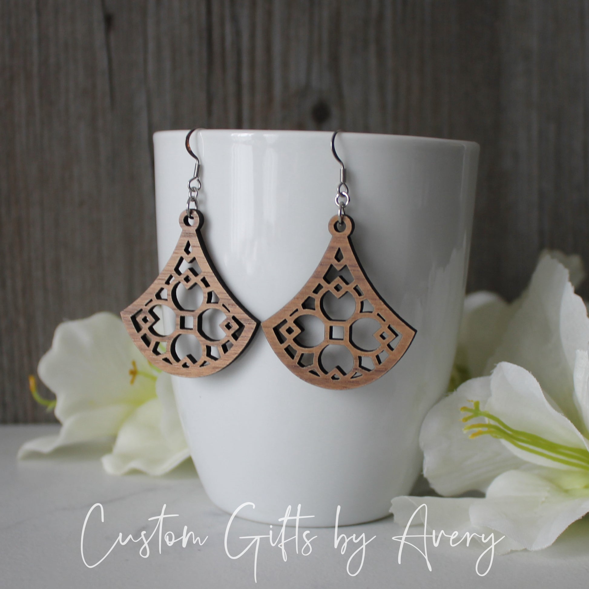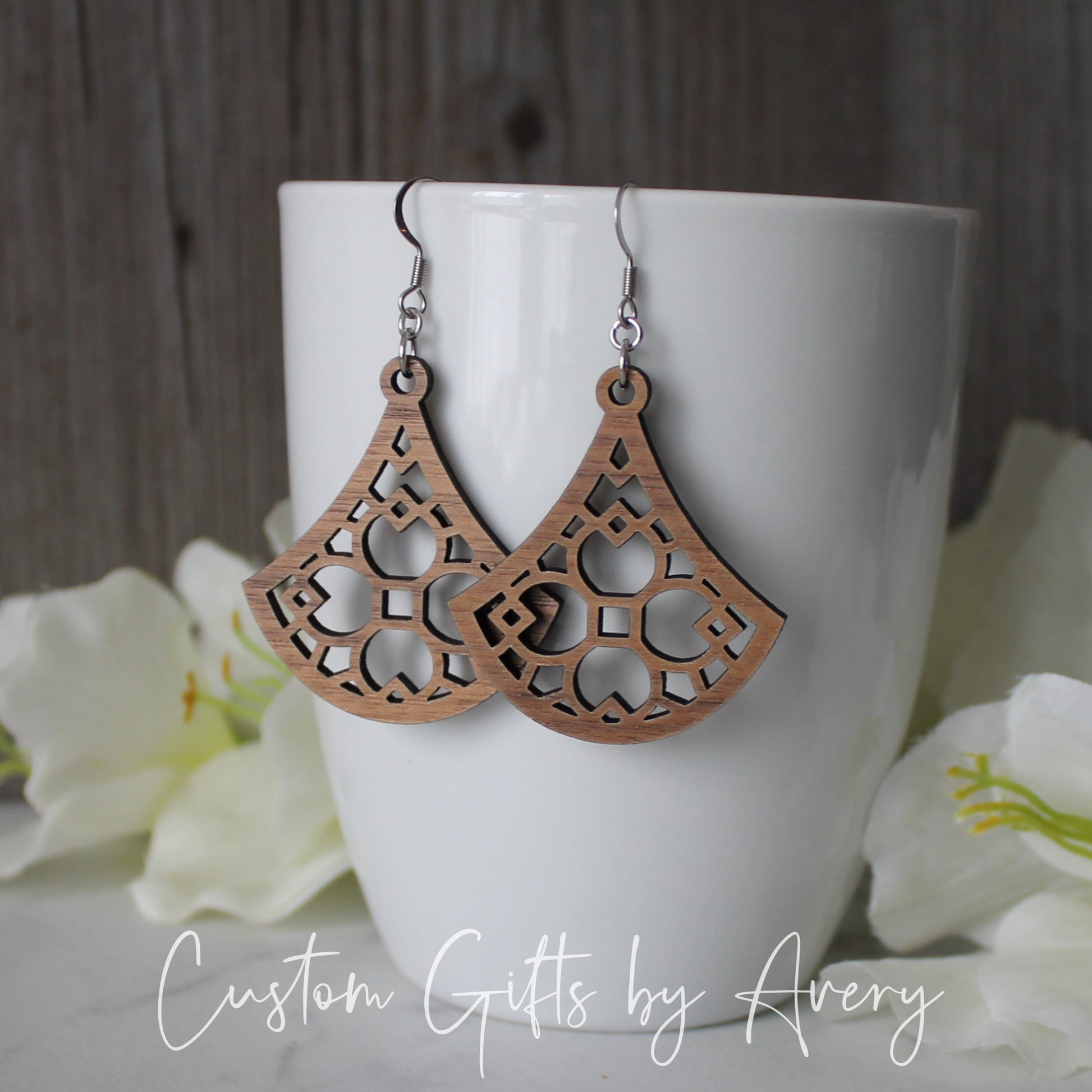 These delicate and intricate earrings have been laser cut from walnut wood. Despite their size, they are incredibly lightweight and very comfortable to wear. They hang from 316L grade stainless steel earring hooks. Stainless steel hooks are the same grade used in industrial and food-processing applications- they are moisture resistant moisture and will not oxidize.